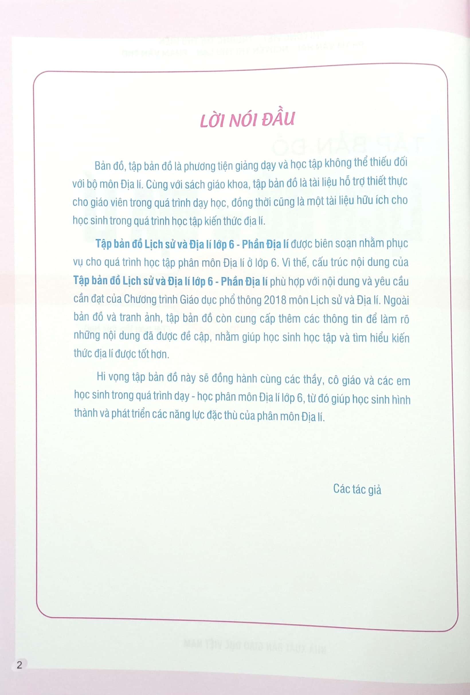 Hi vọng tập bản đồ này sẽ đồng hành cùng các thầy, cô giáo và các em học sinh trong quá trình dạy - học phân môn Địa lí lớp 6, từ đó giúp học sinh hình thành và phát triển các năng lực đặc thù của phân môn Địa lí.