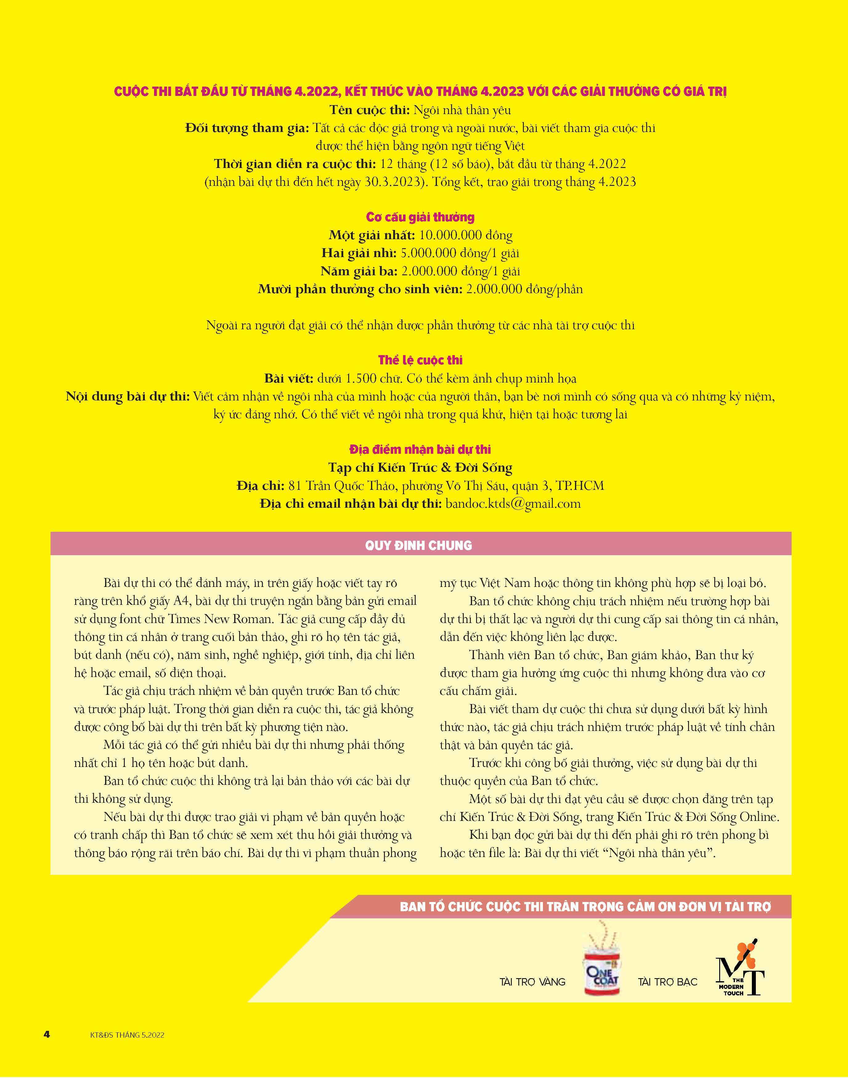 Trong số báo tháng 5.2022, có một nội dung quan trọng mà chúng tôi muốn thông báo đến quý dộc giả là Ban tổ chức cuộc thi viết về Ngôi nhà thân yêu bổ sung thêm 10 phần thưởng dành cho các bài viết hay của các bạn sinh viên tham dự cuộc thi. Chi tiết xin xem ở các trang 3-4 của số báo này. Rất mong được ủng hộ