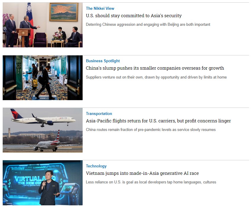 Nikkei Asia là tạp chí tiếng Anh có tên tuổi thuộc tập đoàn Nikkei - Nhật Bản, chuyên viết về những xu hướng kinh tế, công nghệ, chính trị của các nước trong khu vực châu Á - Thái Bình Dương gồm có Việt Nam. Ngoài ra còn cung cấp các phân tích từ chuyên gia, nhà báo về đời sống và văn hóa các nước châu Á. (Trending, Business, Markets,Tech, Politics, Economy, Features, Opinion, Life & Arts).