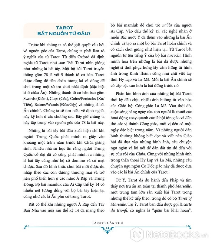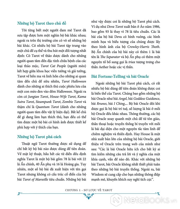 Đây là một công cụ hỗ trợ hiệu quả và tiện lợi nhất cho người đang tìm hiểu về Tarot. TAROT BỎ TÚI như một cuốn sổ tay ghi chép, diễn giải 78 lá bài theo từng cụm ý nghĩa bao gồm các từ khóa chi tiết, nghĩa xuôi, nghĩa ngược của từng lá bài giúp bạn nắm được ý nghĩa, dễ thuộc, dễ hiểu, dễ tra cứu. Ngoài ra sách có các quy tắc và mẹo học Tarot được trình bày theo bảng biểu, sơ đồ để thúc đẩy quá trình học nhanh, hiệu quả hơn.