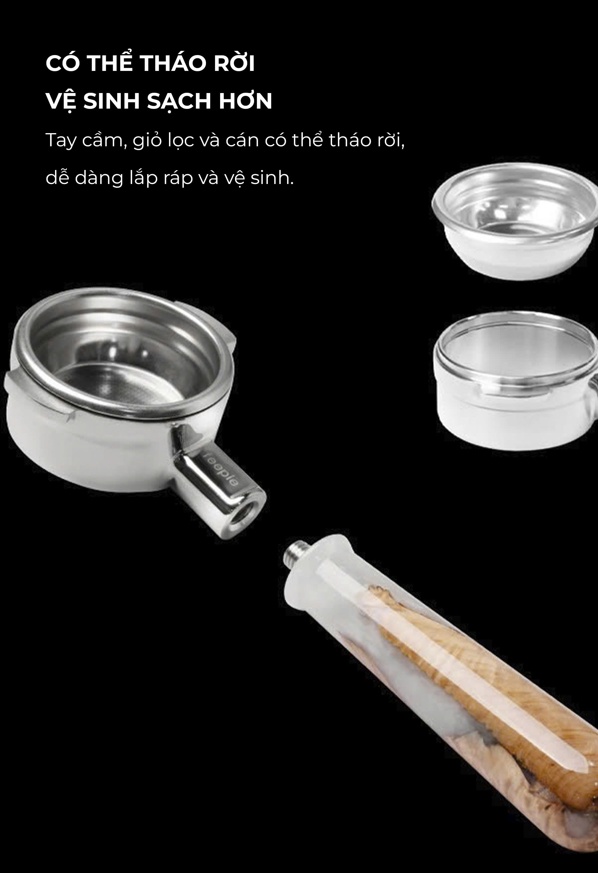 TAY CẦM ESPRESSO KHÔNG ĐÁY VÂN GỖ TỰ NHIÊN FEEPIE Sự kết hợp tuyệt vời giữa gỗ óc chó và nhựa cao cấp mang đến cho bạn trải nghiệm pha chế espresso đẳng cấp. Tay cầm thiết kế không đáy giúp bạn quan sát quá trình chiết xuất cà phê rõ ràng, kiểm soát chất lượng nước trong mỗi tách cà phê. Thiết Kế Vân Gỗ Tự Nhiên - Tinh Tế Và Sang Trọng Tay cầm được chế tác từ gỗ óc chó tự nhiên với đường vân gỗ đặc biệt, mang đến vẻ đẹp tự nhiên và đẳng cấp. Kết hợp với lớp nhựa và inox 304 cao cấp, sản phẩm này không chỉ đảm bảo tính thẩm mỹ mà còn bền bỉ, chống oxi hóa và dễ dàng vệ sinh. Thiết Kế Không Đáy - Quan Sát Quá Trình Chiết Xuất Đặc biệt, tay cầm này sở hữu thiết kế không đáy, giúp bạn quan sát rõ ràng quá trình chiết xuất cà phê trong suốt. Điều này giúp bạn kiểm soát chất lượng espresso một cách tối ưu, đảm bảo mỗi lần pha chế đều đạt được độ sánh mịn, đậm đà như ý. Chất Liệu Inox 304 Cấp Thực Phẩm - An Toàn Với Người Dùng Chất liệu inox 304 không chỉ đảm bảo an toàn cho sức khỏe khi tiếp xúc với thực phẩm mà còn mang lại độ bền cực cao. Inox 304 dễ dàng vệ sinh, chống gỉ sét, và bảo vệ chất lượng cà phê trong suốt quá trình pha chế. Tính Năng Nổi Bật • Chất liệu cao cấp: Gỗ óc chó tự nhiên kết hợp với nhựa và inox 304 cấp thực phẩm giúp tay cầm bền bỉ và an toàn. • Thiết kế không đáy: Mang lại trải nghiệm pha chế hoàn hảo, cho phép bạn quan sát và điều chỉnh quá trình chiết xuất cà phê dễ dàng. • Dễ dàng vệ sinh: Tay cầm và bộ lọc có thể tháo rời, giúp việc vệ sinh dễ dàng và nhanh chóng hơn bao giờ hết. • Cảm giác cầm nắm thoải mái: Thiết kế tay cầm chuẩn xác, dễ sử dụng và hạn chế mỏi tay khi pha chế trong thời gian dài. • Tính thẩm mỹ cao: Đường vân gỗ tự nhiên tạo nên một vẻ đẹp sang trọng, phù hợp với mọi không gian pha chế cà phê tại nhà hay quán.