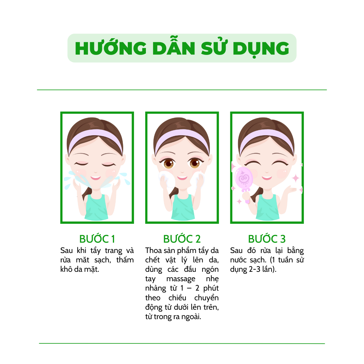 - Thoa sản phẩm tẩy da chết vật lý lên da, dùng các đầu ngón tay massage nhẹ nhàng từ 1 – 2 phút theo chiều chuyển động từ dưới lên trên, từ trong ra ngoài. Sau đó rửa lại bằng nước sạch. (1 tuần xài 2-3 lần).