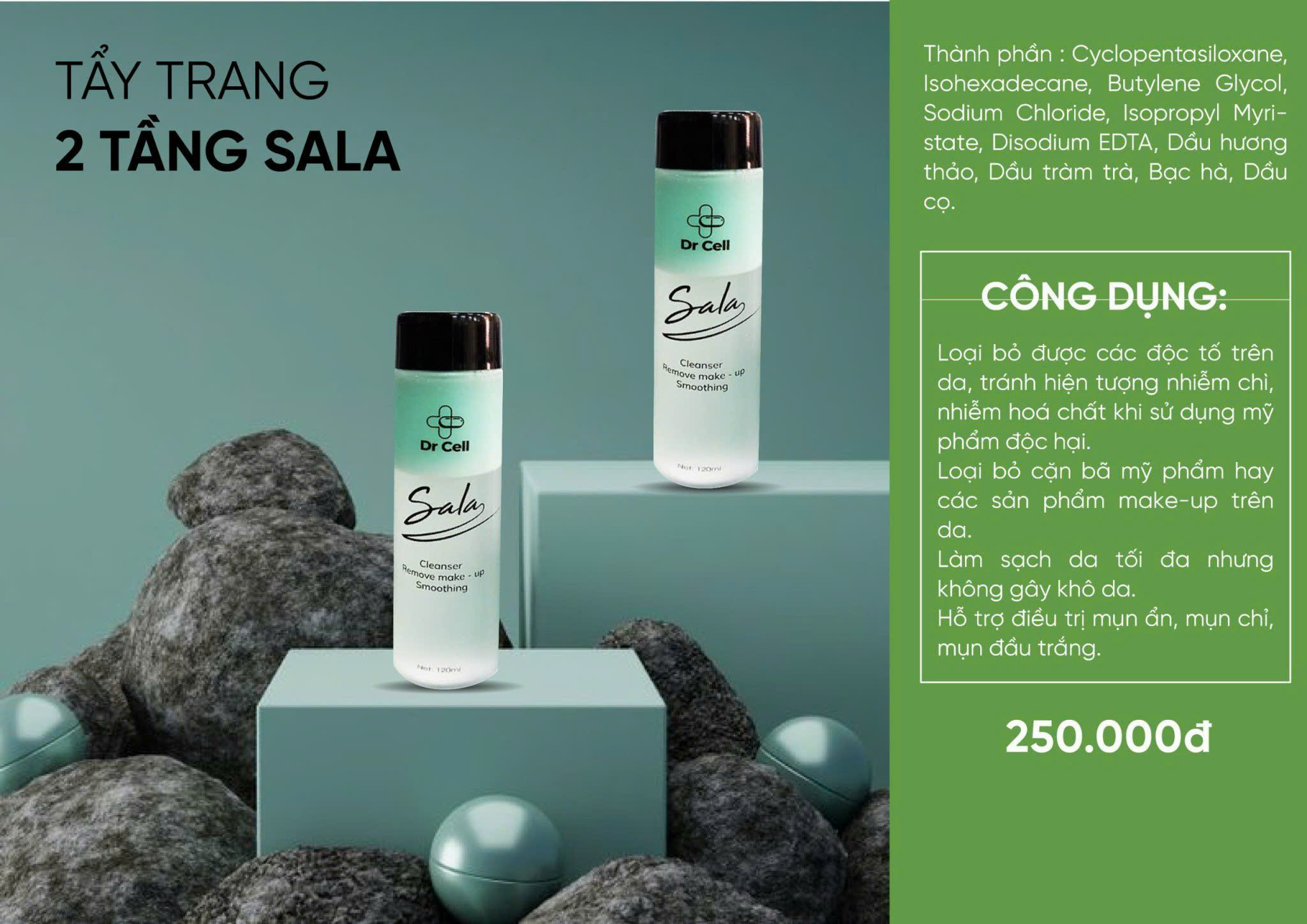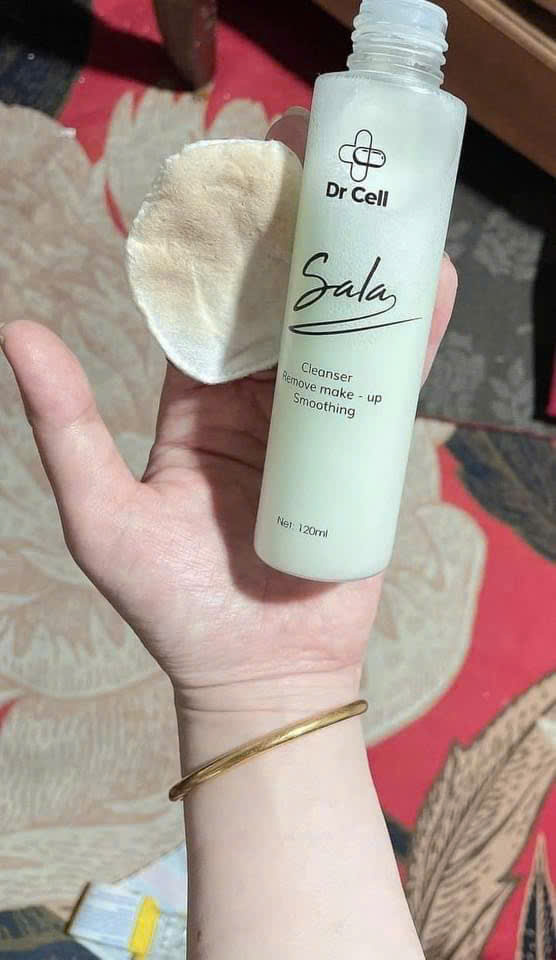 Mua tại TiktokTẩy Trang 2 Tầng Sala Dr Cell 120ml THÀNH PHẦN: Cyclopentasiloxane ,Isohexadecane Bufy-lene Glycol, Sodium Chioride, Isopropyl Myristate, Disodium EDTA, Dầu hương thảo, Dâu tràm trà, bạc hà, dầu cọ. CÔNG DỤNG: - Loại bỏ được các độc tố trên da, tránh hiện tượng nhiễm chì, nhiễm hóa chất khi sử dụng mỹ phẩm độc hại. - Loại bỏ cặn bã mỹ phẩm hay các sản phẩm make - up trên da. - Làm sạch da tối đa nhưng không gây khô da. - Hỗ trợ ngăn ngừa và giảm mụn ẩn, mụn chỉ, mụn đầu trắng. CÁCH DÙNG: Lắc đều chai trước khi sử dụng Cho dung dịch ra miếng bông tẩy trang và lau toàn bộ khắp mặt. Nên lau nhẹ mắt, môi rồi đến các vùng khác. Rửa mặt lại với Sữa Rửa Mặt