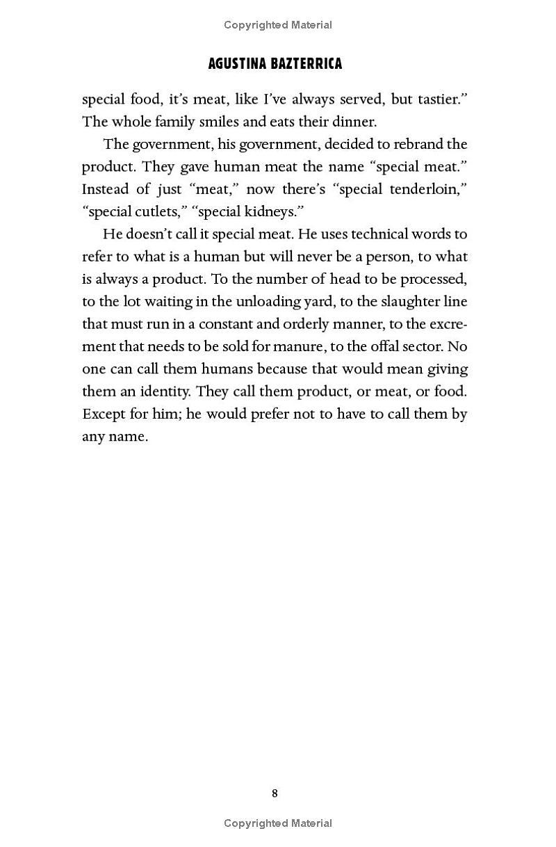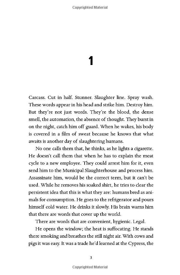 His wife has left him, his father is sinking into dementia, and Marcos tries not to think too hard about how he makes a living. After all, it happened so quickly. First, it was reported that an infectious virus has made all animal meat poisonous to humans. Then governments initiated the “Transition.” Now, eating human meat—“special meat”—is legal. Marcos tries to stick to numbers, consignments, processing.