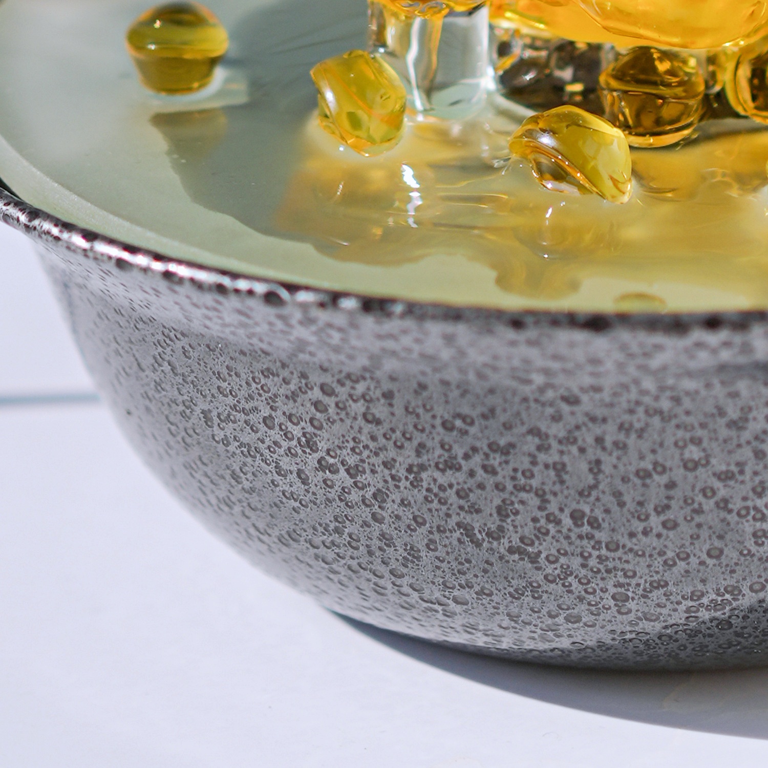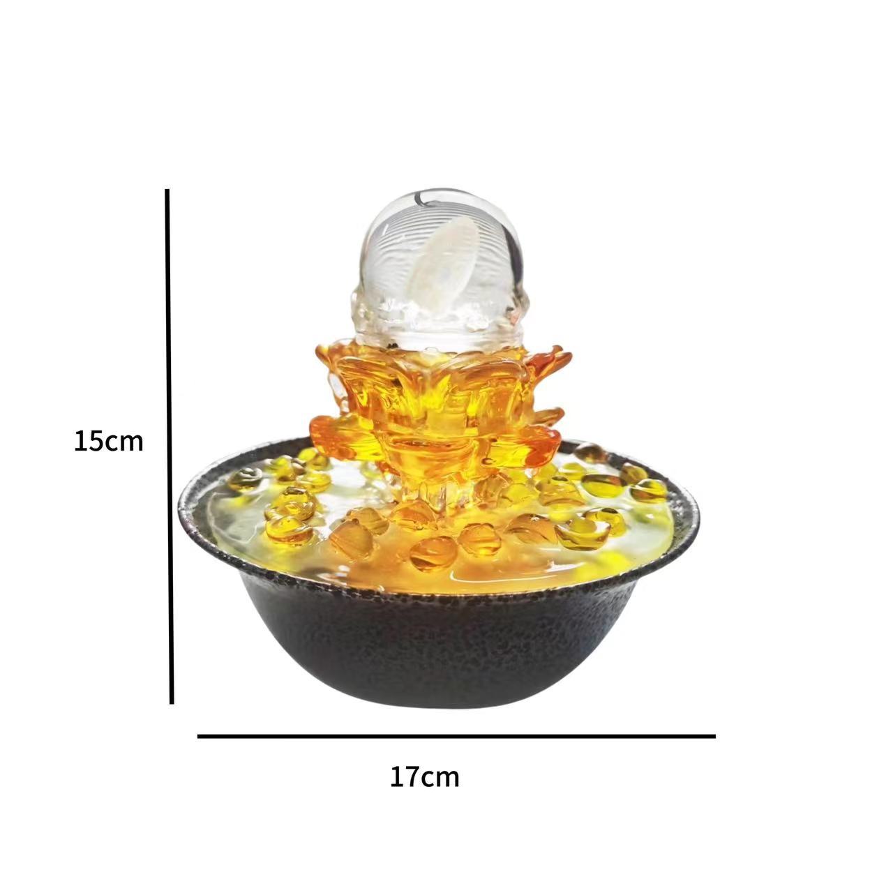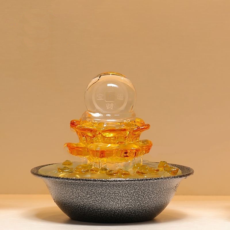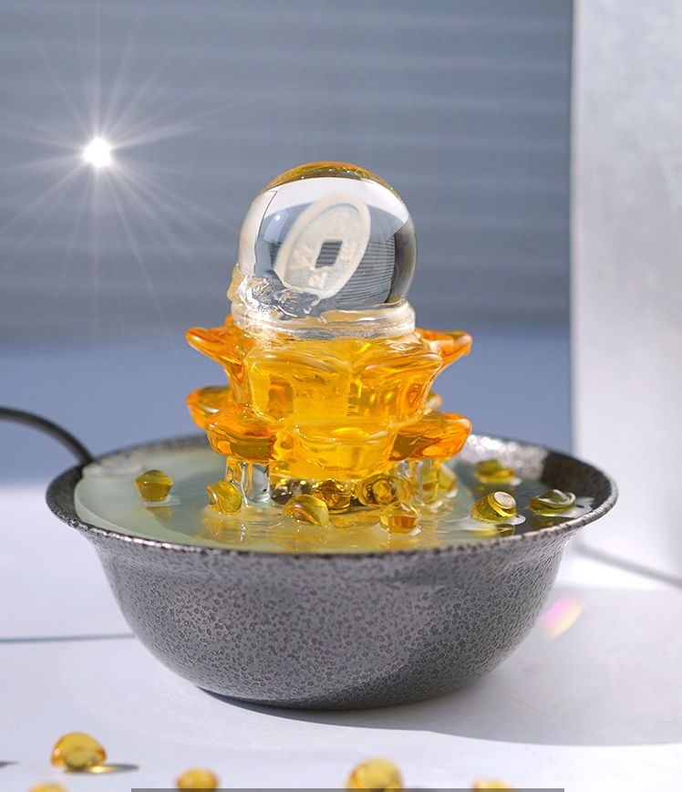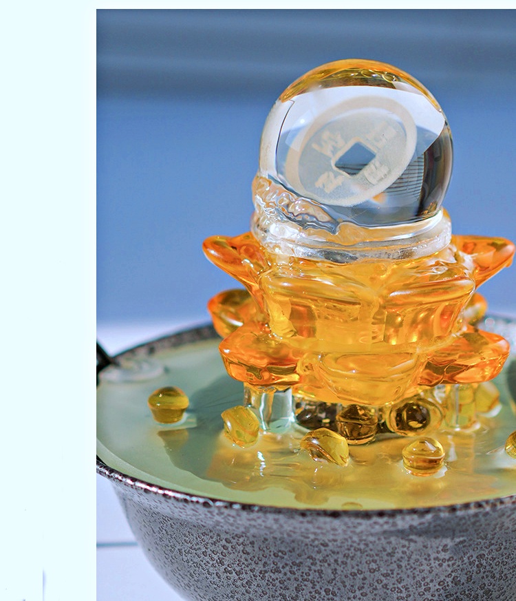 Sản phẩm thủ công , thiết kế với mạch nước chảy phun từ dưới lên đài hoa sen truyền đến ngọc thủy tinh khắc hoa văn đồng xu bên trong.Khi hoạt động ngọc xoay tròn tạo nên nguồn năng lượng tốt. Điều hòa và tăng Tài Khí cho gia chủ.