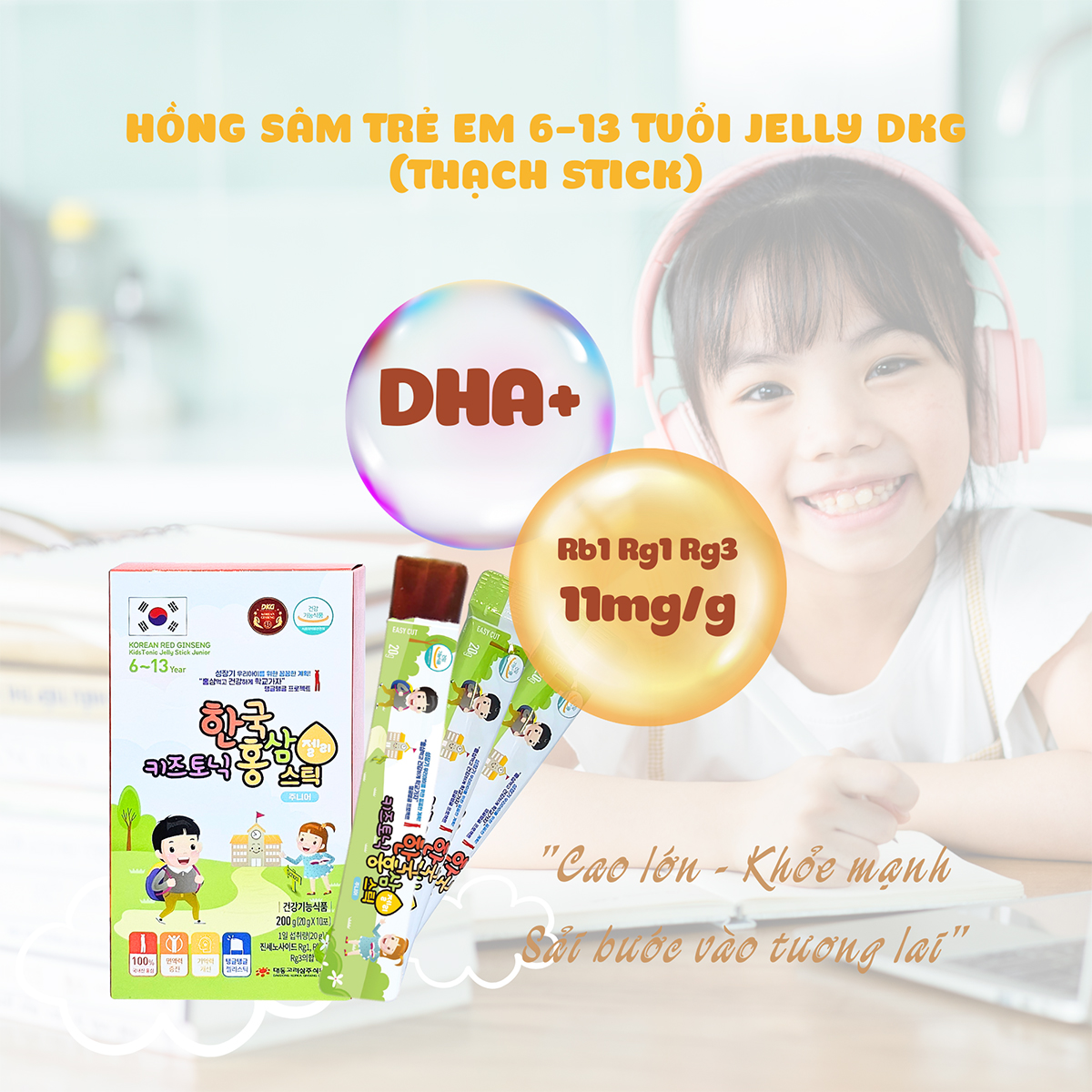 Hồng sâm trẻ em 6-13 tuổi Jelly DKG (thạch stick) là sản phẩm “duy nhất” trên thị trường được bổ sung thêm “DHA và Canxi”, giúp bé ở độ tuổi này phát triển toàn diện cả về thể chất, chiều cao và trí não.