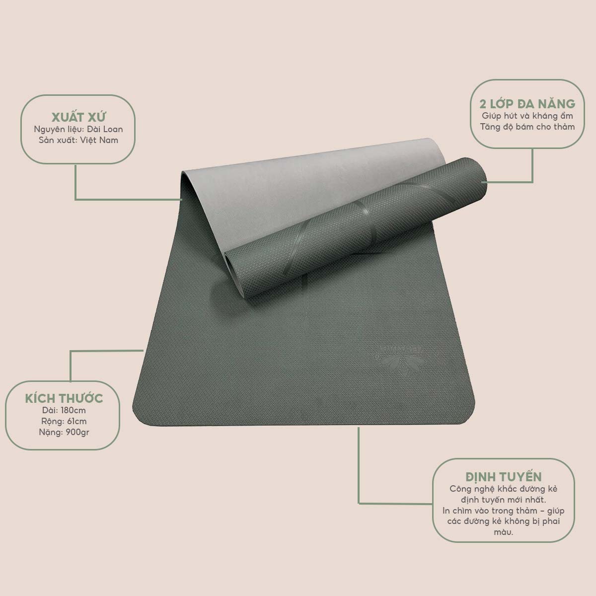 1.Thông số kỹ thuật của thảm yoga Eco TPE 2 lớp 6mm cao cấp. Xuất xứ: Đài Loan. Kích thước sản phẩm: D x R x C - 183 x 61 x 0.6 (cm). Kết cấu: