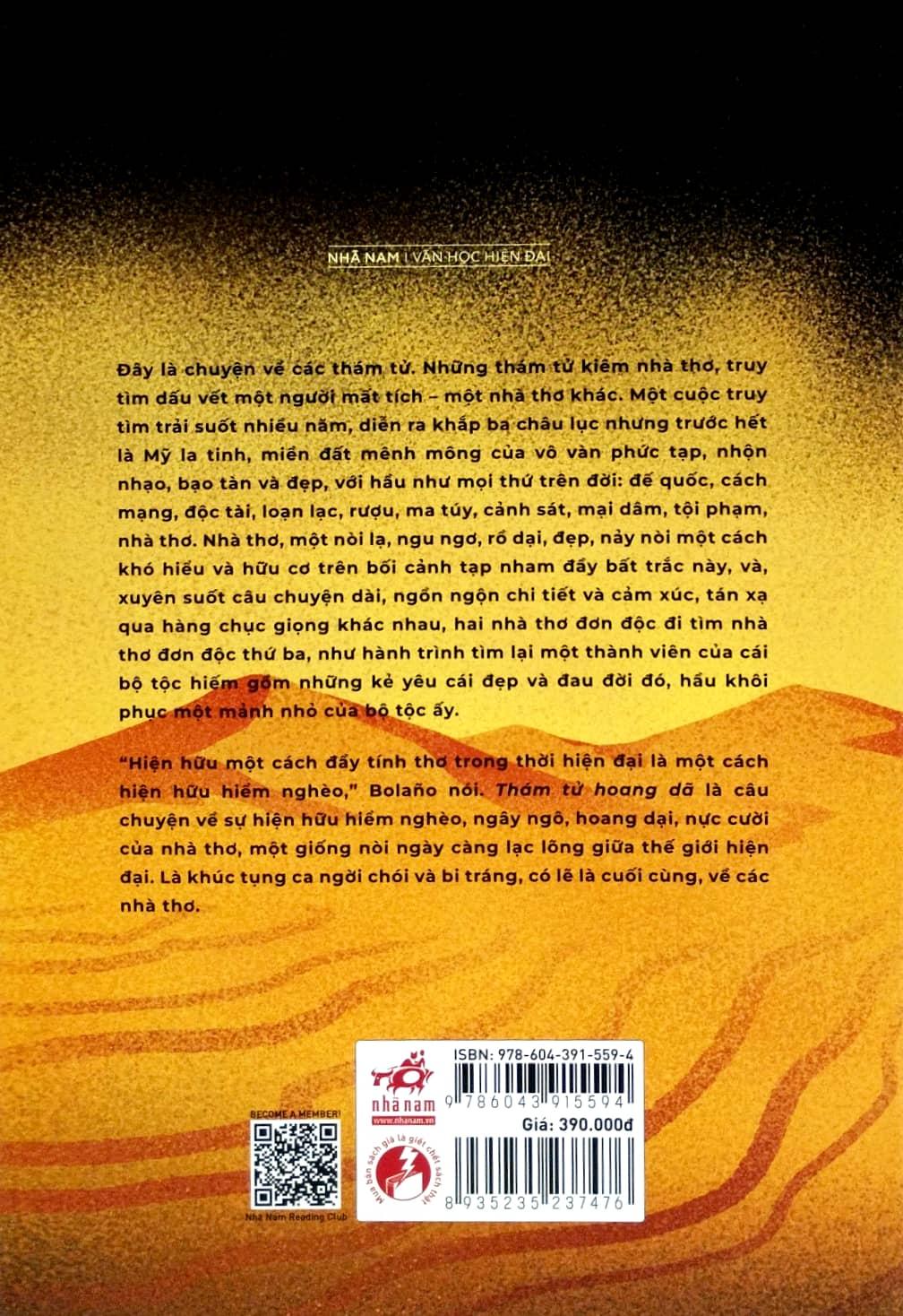 “Hiện hữu một cách đầy tính thơ trong thời hiện đại là một cách hiện hữu hiểm nghèo,” Bolaño nói. Thám tử hoang dã là câu chuyện về sự hiện hữu hiểm nghèo, ngây ngô, hoang dại, nực cười của nhà thơ, một giống nòi ngày càng lạc lõng giữa thế giới hiện đại. Là khúc tụng ca ngời chói và bi tráng, có lẽ là cuối cùng, về các nhà thơ.