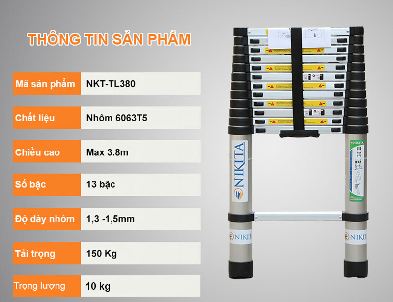 THÔNG SỐ KỸ THUẬT - Kích thước: 87x48x9 cm - Chiều cao tối đa: 3.8m - Chiều cao rút gọn: 0.81m - Số bậc: 13 bậc - Chất liệu: Hợp kim nhôm - Độ dày