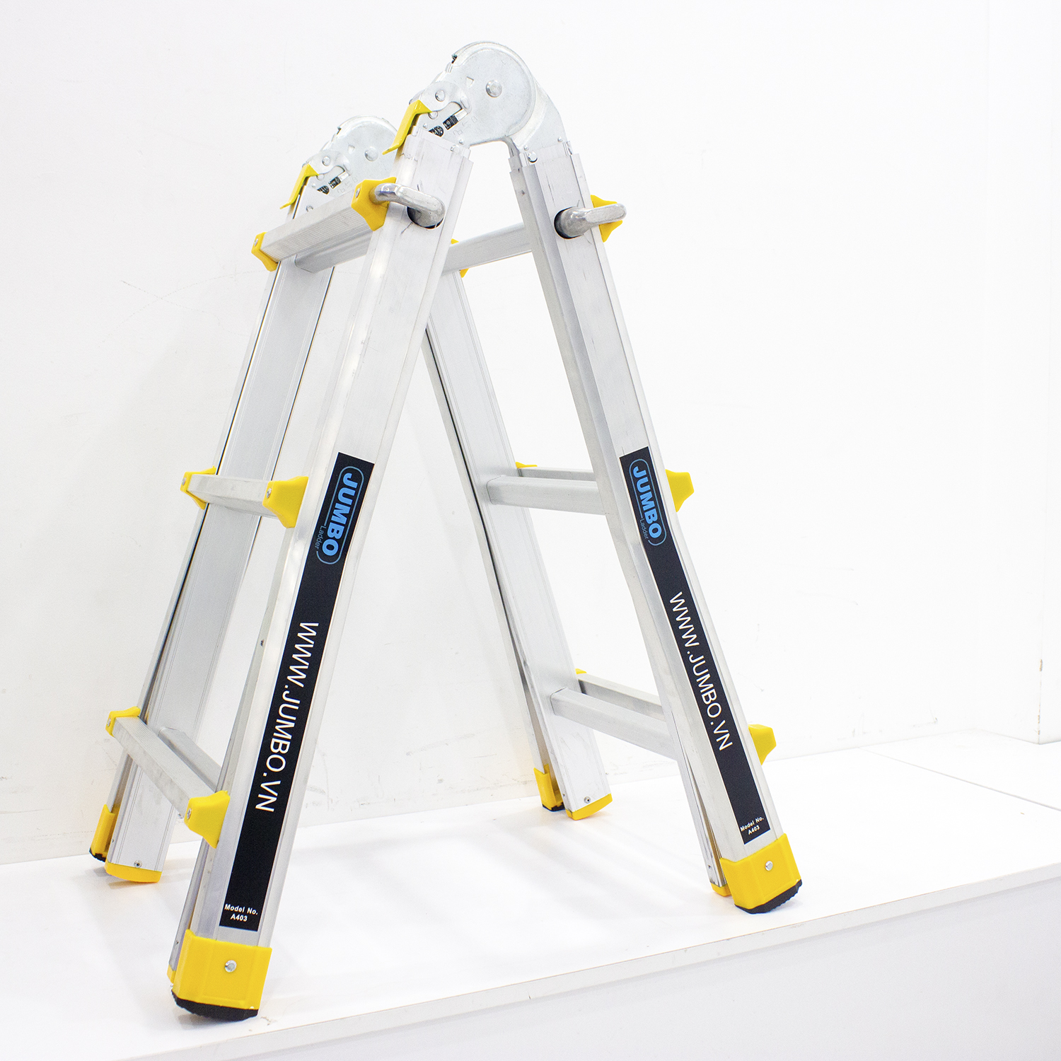- Chân đế được gắn cao su rất chắc chắn. Thang nhôm rút lồng Jumbo A403 đem lại sự tiện dụng cho người dùng nhờ kiểu thang được thiết kế linh hoạt. Bạn có thể sử dụng như một chiếc thang chữ A, chữ I và có thể xếp theo hình so le để phù hợp khi làm việc trên cầu thang. Thang nhôm trượt đa năng JUMBO A403 là sự tổng hợp của thang chữ A, thang nhôm rút gọn và thang trượt. Ưu điểm lớn của loại thang này chính là có thể sử dụng giữa các bậc thang (cải tiến nhược điểm của thang chữ A). Video giới thiệu thang nhôm trượt JUMBO A403 Jumbo A403 được làm từ hợp kim nhôm được mạ lớp chống gỉ sáng bóng, không chỉ mang lại độ chắc chắn và độ bền cao mà còn đảm bảo tính thẩm mỹ cho người dùng.