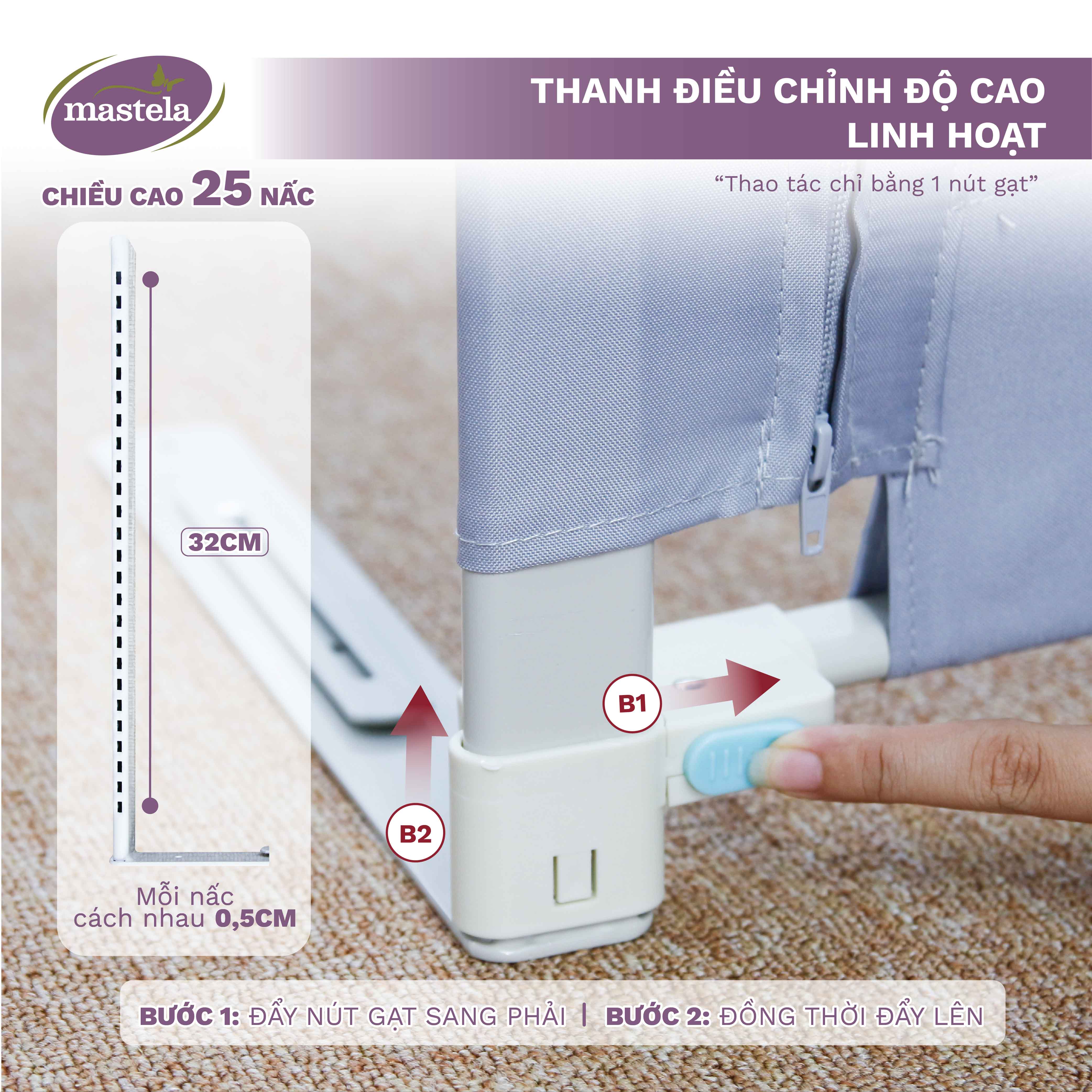 - Thanh chắn giường Mastela còn có thể điều chỉnh độ cao, bố mẹ có thể thoải mái điều chỉnh tùy phù hợp theo chiều cao của đệm.