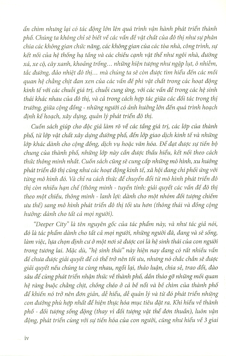 “Thành phố Sâu hơn” (Deeper City) là một tác phẩm giúp chúng ta xây dựng tư duy sâu nhờ vào quá trình từng bước đào sâu vào các vấn đề của thành phố để có một cái nhìn tổng thể, toàn diện cho các vấn đề không chỉ là bề nổi dễ nhận thấy mà còn là cả những vấn đề sâu sắc hơn, phi vật chất, ẩn chìm nhưng lại có tác động lớn lên quá trình vận hành phát triển thành phố. Chúng ta không chỉ sẽ biết về các vấn đề vật chất của đô thị như sự phân chia các không gian chức năng, các không gian của các tòa nhà, công trình, sự kết nối của hệ thống hạ tầng và các chiều cạnh vật thể như ngôi nhà, đường xá, xe cộ, cây xanh, khoảng trố những hiện tượng như ngập lụt, ô nhiễm, tắc đường, đảo nhiệt đô thị. mà chúng ta sẽ còn được tìm hiểu đến các mối quan hệ chằng chịt đan xen của các vấn đề phi vật chất trong các hoạt động kinh tế với các chuỗi giá trị, chuỗi cung ứng, với các vấn đề trong các hệ sinh thái khác nhau của đô thị, và cả trong cách hợp tác giữa các đối tác trong thị trường, giữa cộng đồng - những người có ảnh hưởng lớn đến quá trình hoạch định kế hoạch, xây dựng, quản lý phát triển đô thị.