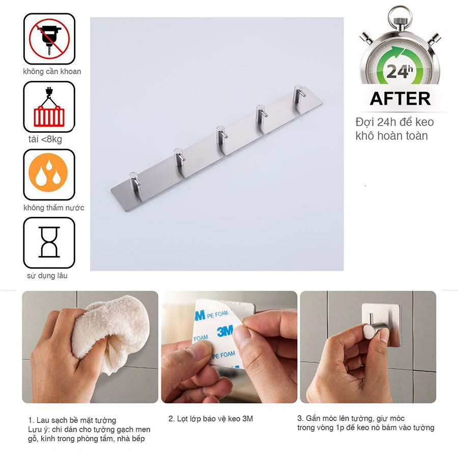 COMBO 4 MÓC TREO QUẦN ÁO - INOX 304 - DÁN TƯỜNG GẠCH MEN