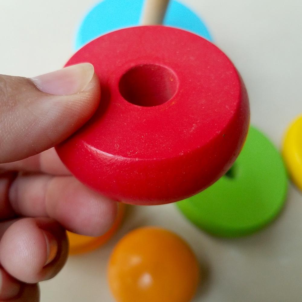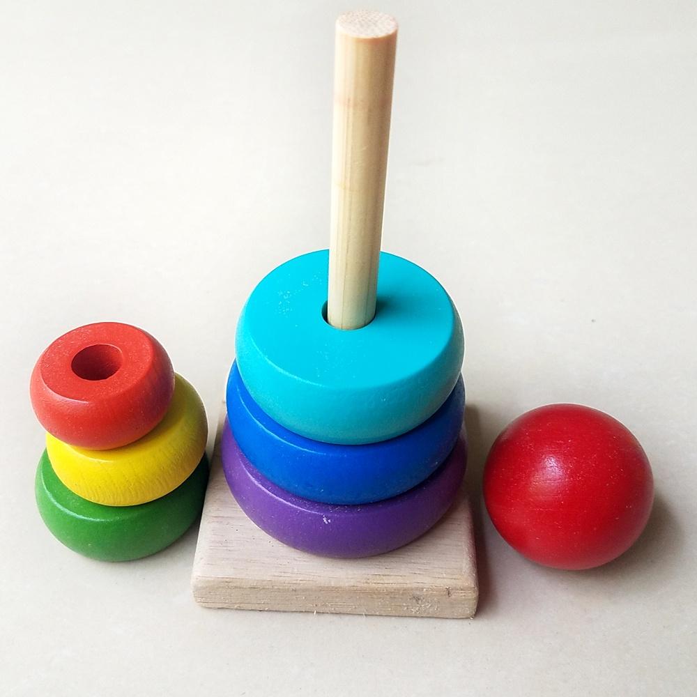 - Giúp bé linh hoạt trong việc nhận dạng màu sắc và kích thước các vòng tròn, từ đó bé có thể xếp chúng theo thứ tự nhỏ dần tạo thành ngọn tháp cân đối, vừa mang tính tìm tòi, vừa rèn luyện khả năng nhận biết kích thước đồ vật cho bé.