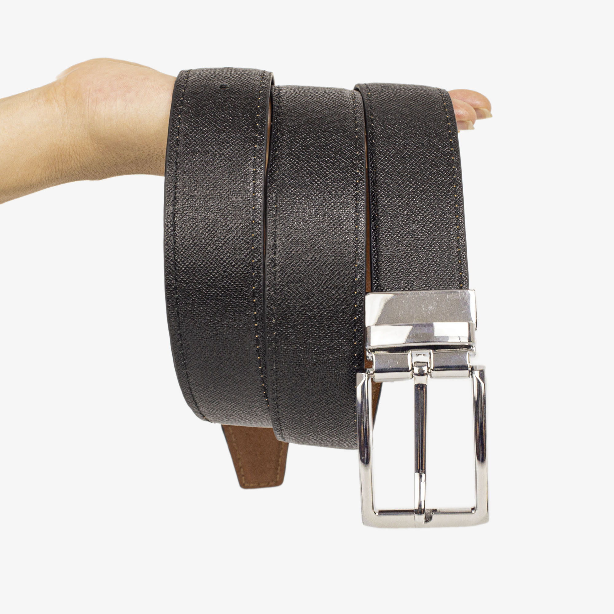 Dây nịt nam da Saffiano-khóa cài xoay dùng được cả 2 mặt nâu đen