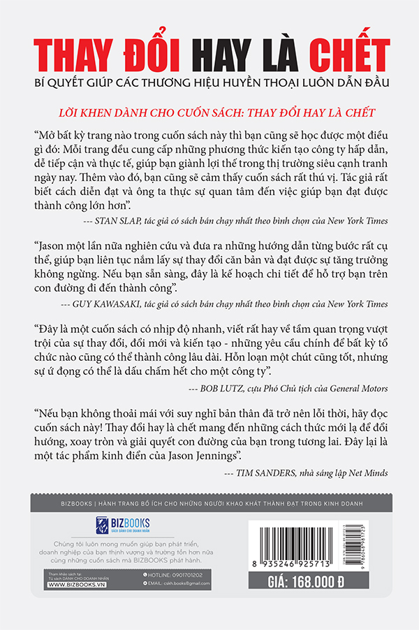 – Nếu bạn không thoải mái với suy nghĩ bản thân đã trở nên lỗi thời, hãy đọc cuốn sách này! – “Thay đổi hay là chết” mang đến những cách thức mới lạ để đổi hướng, xoay tròn và giải quyết con đường của bạn trong tương lai. – Đây là một cuốn sách có nhịp độ nhanh, viết rất hay về tầm quan trọng vượt trội của sự thay đổi, đổi mới và kiến tạo – những yêu cầu chính để bất kỳ tổ chức nào cũng có thể thành công lâu dài. Thay đổi hay là chết bí quyết thành công của các nhà lãnh đạo kiến tạo thành công Bản chất công việc cũng như cách vận hành doanh nghiệp rốt cuộc rồi sẽ thay đổi. Cơ may duy nhất để bất kỳ ai trong chúng ta đạt được thành công là liên tục tái hình dung, tái suy nghĩ và tái kiến tạo mọi thứ ta làm cùng cách thức ta làm, để luôn bắt kịp với thời đại hay nói cách khác là nếu muốn thích ghi bạn phải lựa chọn thay đổi hay là chết. Tất cả chúng ta đều phải trở thành các nhà lãnh đạo kiến tạo, và tốt hơn hết ta nên thực hiện điều này thật nhanh chóng. So sánh 25 công ty đứng đầu danh sách 500 công ty lớn nhất Hoa Kỳ theo bình chọn của tạp chí Fortune trong năm 2000 và năm 2010, kết quả thật đáng kinh ngạc. Có tới 16 trong số 25 công ty đó rơi khỏi đỉnh cao chỉ trong vòng 10 năm. Gần hai phần ba! Tìm hiểu sâu hơn, bạn sẽ thấy từ khi danh sách “Fortune 500” được công bố lần đầu vào năm 1955, hơn 90% công ty trong danh sách đó đã bị những đối thủ nhỏ hơn càn quét, bị phá sản, bị thu nhỏ lại tới mức không còn là cái tên quan trọng nữa, hoặc đơn giản là đã đóng cửa. Dĩ nhiên, những thể chế thịnh vượng này đã có những nguồn tài chính và nhân lực để đảm bảo thành công bền vững. Amoco bị sát nhập; Esmark bị Beatrice Foods thu mua, sau đó bị ConAgra chiếm lấy; Armour bị chia nhỏ; Navistar bị loại khỏi sàn giao dịch chứng khoán New York; Union Carbide bị Dow nuốt chửng; Firestone cuối cùng bị bán cho một công ty cổ phần Nhật Bản. Chỉ duy nhất một công ty – DuPont – xuất hiện trên tất cả danh sách Fortune 500. Tất cả những công ty này đều thất bại trong việc liên tục tăng trưởng, thay đổi, lớn mạnh và kiến tạo bản thân, và cuối cùng họ đã bị loại ra khỏi cuộc chơi. Ngày nay, công nghệ khiến mọi thứ ngày càng minh bạch, và khách hàng tin rằng họ có thể có chính xác thứ mình muốn ngay lập tức với cái giá họ sẵn sàng chi trả, tất cả những điều này khi kết hợp lại với nhau gây ảnh hưởng tới môi trường kinh doanh với luật chơi đã bị thay đổi. Bất kỳ ai nghĩ rằng mình là ngoại lệ và không cần liên tục kiến tạo doanh nghiệp, thì thực chất, họ chỉ đang lảng tránh sự thật mà thôi. Thay đổi để thành công hay luôn thất bại vì không chịu thay đổi Thay vì thừa nhận trách nhiệm cá nhân và giải quyết nguyên nhân gốc rễ của sự thiếu tăng trưởng – chính là thái độ chần chừ không đón nhận thay đổi triệt để, nhiều lãnh đạo doanh nghiệp dành thời gian tìm các lý do bào chữa cho thành tích nghèo nàn của họ. một số ví dụ biện hộ thường dùng nhất: “Đó là do nền kinh tế; chúng ta sẽ tốt lên khi thời thế tốt lên”. Nhưng bạn nên nhớ, những công ty tận tâm với sự tăng trưởng luôn đi trước đón đầu mong muốn của khách hàng, họ có dấu ấn về văn hóa và đạt được mục tiêu đó thông qua thay đổi liên tục và kiến tạo triệt để. Khi một doanh nghiệp tăng trưởng nhanh, mọi cổ đông, mọi bên liên quan – nhân viên, lãnh đạo, khách hàng, nhà cung cấp và nhà đầu tư – đều hạnh phúc và được hưởng những phần thưởng về mặt tài chính. Khi một doanh nghiệp không tăng trưởng, cũng chính các bên liên quan đó phải hứng chịu tổn thất tài chính, họ tưởng tượng về những ngày tháng tương lai tăm tối hơn hiện ra lờ mờ ở phía chân trời, và cuối cùng họ bắt đầu tìm kiếm cơ hội tốt hơn ở nơi khác.   Cuốn sách “Thay đổi hay là chết” – Bí quyết dẫn đầu của mọi doanh nghiệp Thay vì thừa nhận trách nhiệm cá nhân và giải quyết nguyên nhân gốc rễ của sự thiếu tăng trưởng – chính là thái độ chần chừ không đón nhận thay đổi triệt để, nhiều lãnh đạo doanh nghiệp dành thời gian tìm các lý do bào chữa cho thành tích nghèo nàn của họ. một số ví dụ biện hộ thường dùng nhất: “Đó là do nền kinh tế; chúng ta sẽ tốt lên khi thời thế tốt lên”. Nhưng bạn nên nhớ, những công ty tận tâm với sự tăng trưởng luôn đi trước đón đầu mong muốn của khách hàng, họ có dấu ấn về văn hóa và đạt được mục tiêu đó thông qua thay đổi liên tục và kiến tạo triệt để. Khi một doanh nghiệp tăng trưởng nhanh, mọi cổ đông, mọi bên liên quan – nhân viên, lãnh đạo, khách hàng, nhà cung cấp và nhà đầu tư – đều hạnh phúc và được hưởng những phần thưởng về mặt tài chính. Khi một doanh nghiệp không tăng trưởng, cũng chính các bên liên quan đó phải hứng chịu t