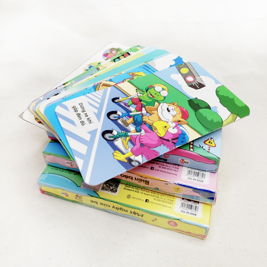 Bao gồm: 30 thẻ tình huống an toàn giao thông, 2 thẻ trợ giúp, 1 sổ tay hướng dẫn, tặng kèm Sticker. Bộ thẻ là câu chuyện của Vẹt con và các bạn khi tham gia giao thông, giúp bé bước đầu làm quen và hiểu luật để đi đường an toàn hơn. Mặt trước là 30 thẻ tình huống vui nhộn và gần gũi, đề cập đến những tình huống thường gặp nhất khi bé tham gia giao thông. Với sự hỗ trợ của 2 thẻ trợ giúp, bé thỏa thích khám phá để nhận biết và phân biệt tình huống đúng – sai qua hình minh họa sinh động và ghi chú chi tiết trên từng thẻ. Mặt sau thẻ là trò chơi ghép hình thú vị. Bé tự do tìm tòi ghép hình hoặc lồng ghép vào các trò chơi được thiết kế sẵn cho bộ thẻ. Bên cạnh đó, mặt sau còn có ký hiệu của 2 thẻ trợ giúp, bé dễ dàng kiểm tra lại đáp án khi chơi một mình hoặc chơi cùng bạn bè.