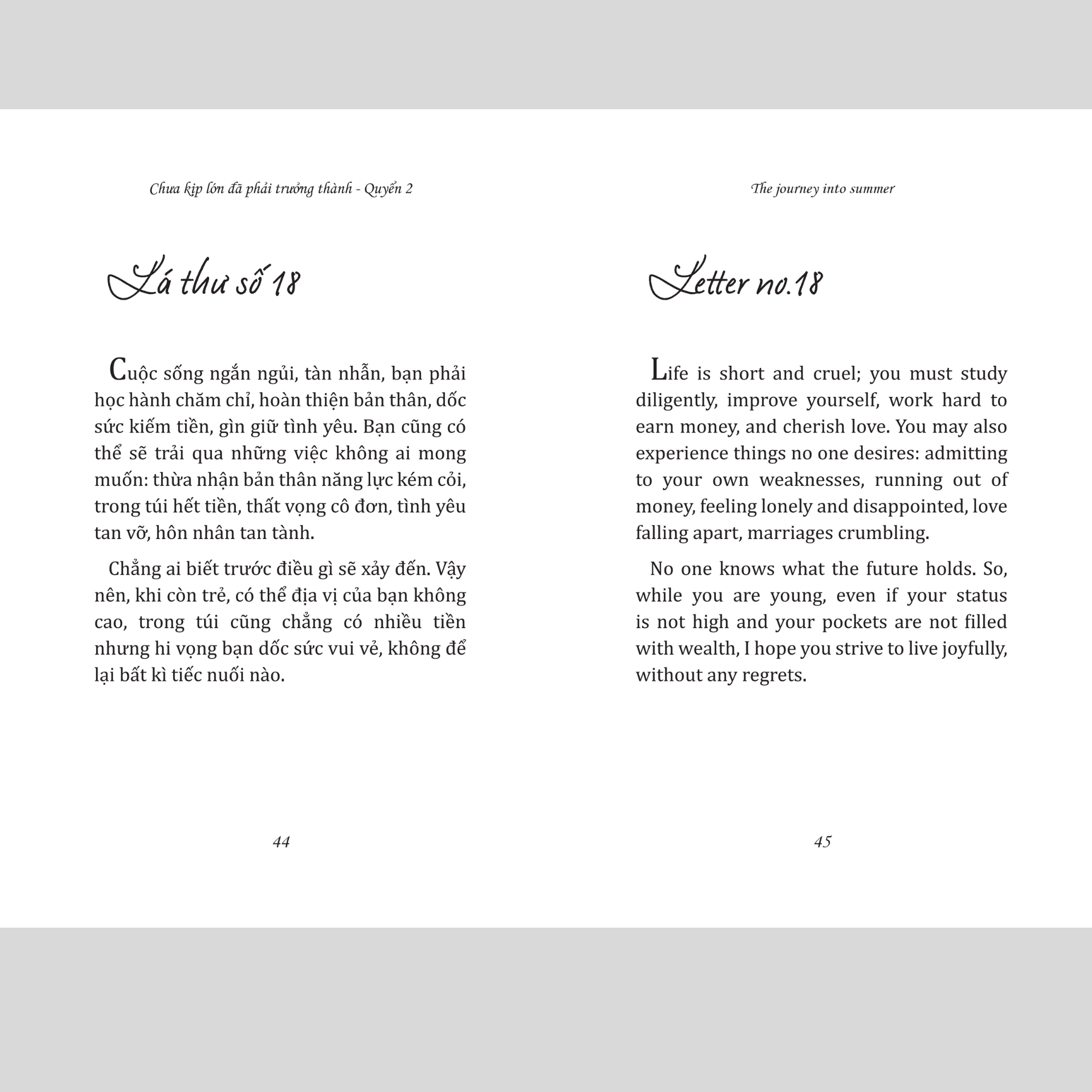 Những lời tâm tình về tuổi trẻ dám sống hết mình vì ước mơ được viết bằng hai ngôn ngữ Anh - Việt trong cuốn sách "THE JOURNEY INTO SUMMER - Chưa kịp lớn đã phải trưởng thành quyển 2" sẽ truyền cảm hứng cho bạn thêm tin vào chính mình.