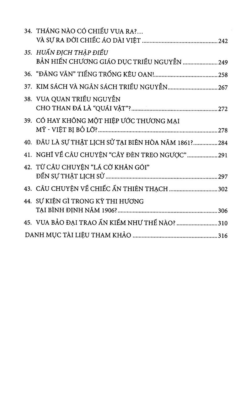 Viết về đề tài lịch sử của các triều đại không thể không quan tâm đến giai thoại lịch sử. Bởi trong quá khứ và kể cả hiện tại, có những giai thoại lịch sử đã vô tình trở thành sự kiện lịch sử. Nhiều giai thoại được lưu truyền từ đời này sang đời khác, từ đó, được mọi người nhắc đi nhắc lại trên nhiều lĩnh vực, và đến một lúc nào đó, được các nhà nghiên cứu ghi chép lại, thế là giai thoại đã trở thành sự kiện, mặc dù các nội dung đó không dựa trên một chứng cứ khoa học, hoặc tư liệu lịch sử nào. Các giai thoại như “Câu chuyện lá cờ khăn gói”, “Cây đèn treo ngược”, “Vua quan triều Nguyễn cho than đá là quái vật”,… cũng như một số ghi chép liên quan đến Lê Văn Duyệt, Phan Thanh Giản, Phan Đình Phùng… đều nằm trong thực trạng đó. Với nguồn tài liệu phong phú từ tủ sách gia đình, cũng như sự hỗ trợ của nhiều nhà nghiên cứu, biên khảo, bạn bè,… tác giả đã tập hợp, kết nối nhiều nguồn tư liệu khác nhau, và bằng phương pháp tư duy khoa học theo đặc trưng bộ môn, người viết đã chứng minh và trả lại sự thật trong nhiều trường hợp thường được gọi là giai thoại lịch sử.