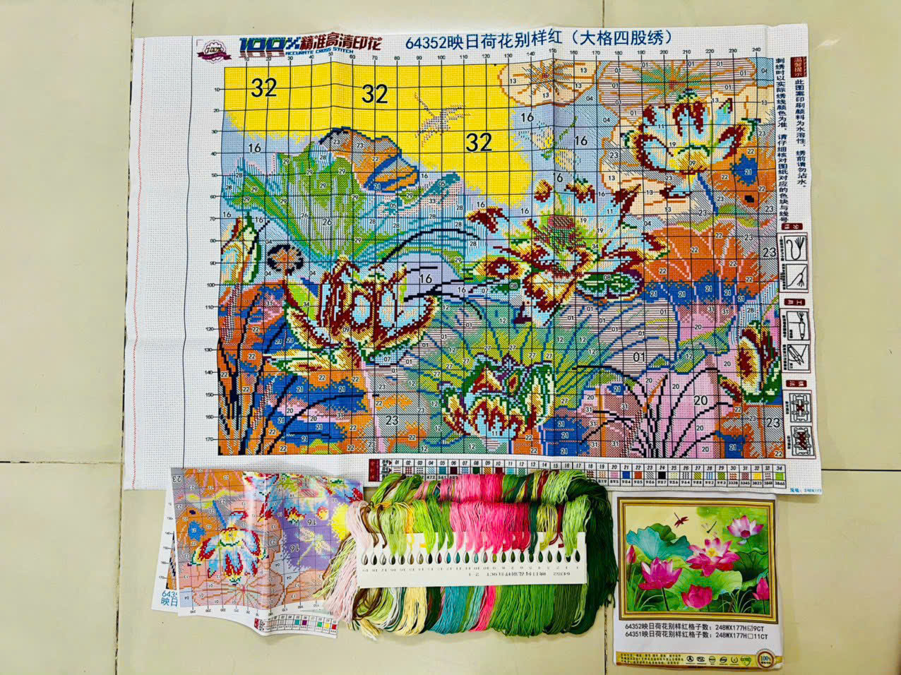 ✨[Thêu 4 sợi] Tranh thêu kín chữ thập Hoa sen 64352, 9CT, kích thước 80 x 60 cm