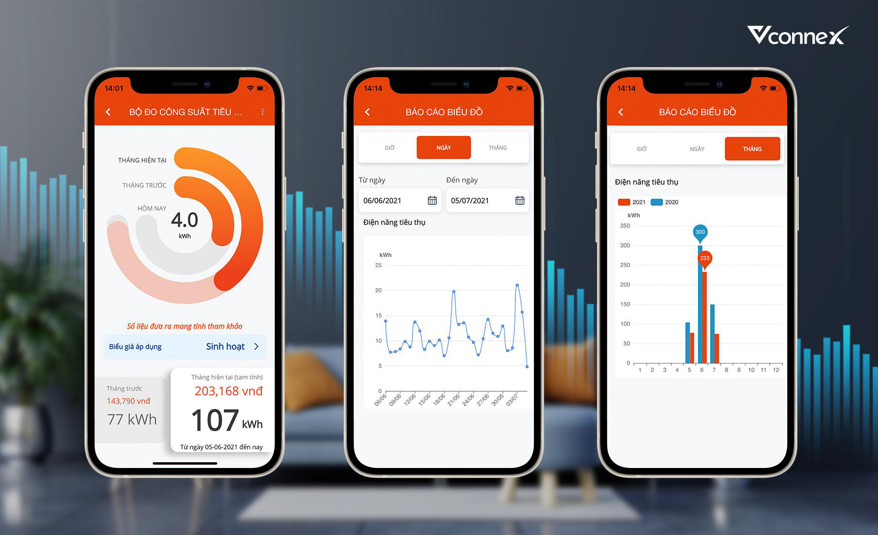 - Theo dõi chỉ số tiêu thụ điện theo thời gian thực trên thiết bị và ứng dụng di động.