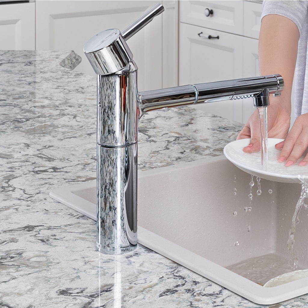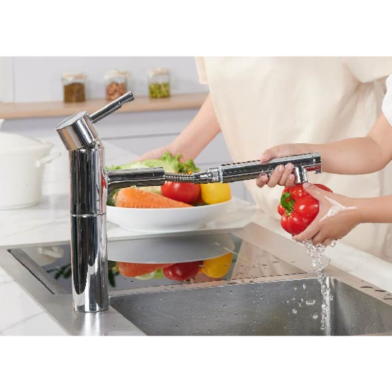 - Đầu vòi nước chuyên dụng: Có thể kéo dài giúp mở rộng vùng sử dụng. Đầu vòi có công tác chuyển nước dạng tia sen và tia thường. Vòi làm từ nhựa ABS cao cấp mạ Chrome sáng bóng, dễ lau chùi.
