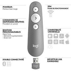 ** Tính năng, đặc điểm : - Điều khiển từ xa không dây R400 dành cho thuyết trình được thiết kế để hỗ trợ bạn trình bày quan điểm của mình trong một cuộc họp.
