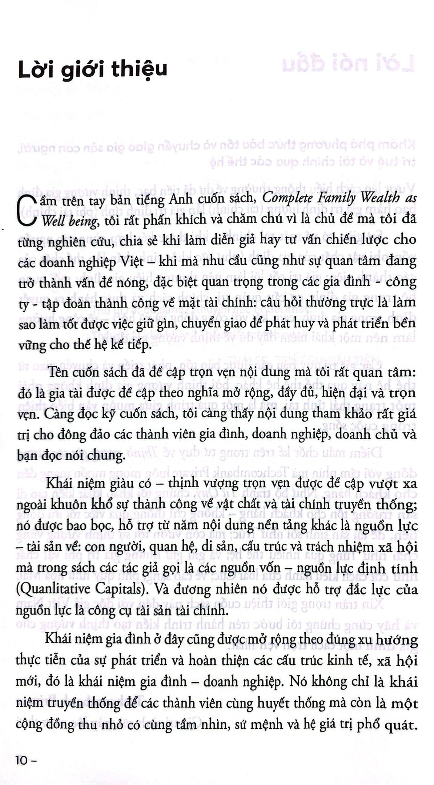 Mua tại TiktokThịnh Vượng Gia Tộc (Bìa mềm) Thịnh vượng gia tộc giúp chúng ta phát triển, duy trì và quản lý tài sản qua các thế hệ. Cuốn sách là tập hợp những hướng dẫn được cập nhật và mở rộng để thay đổi cách bạn nghĩ về sự giàu có và di sản của m.ình. Cuốn sách còn cung cấp câu trả lời bạn cần cùng với hướng dẫn và chiến lược để giữ nguyên khối tài sản của gia đình bạn. Thịnh vượng gia tộc cung cấp tư duy mới nhất về thịnh vượng, những ý tưởng và thực hành có ý nghĩa lâu dài để các gia đình duy trì, phát triển và quản lí tài sản qua các thế hệ. Cuốn sách là tập hợp những hướng dẫn được cập nhật và mở rộng để thay đổi cách chúng ta nghĩ về thịnh vượng và di sản của m.ình. Thịnh vượng đích thực vượt lên trên tiền bạc đơn thuần, bao gồm 6 loại gia sản: