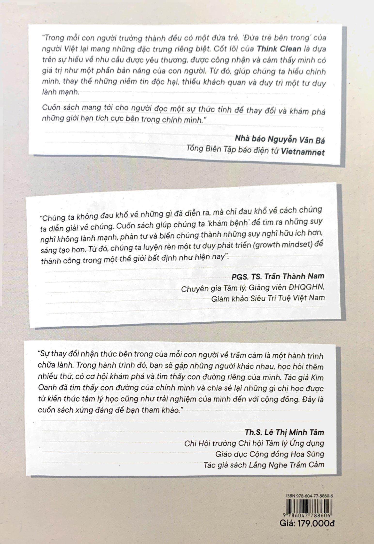 Think Clean – Đừng tin vào tất cả những gì bạn nghĩ là cuốn sách xuất hiện đúng lúc mà con người hiện đại đang mệt mỏi hơn bao giờ hết. Họ mệt mỏi bởi những áp đặt, định kiến, kì vọng của xã hội và bởi sự phát xét thiếu công bằng mà họ dành cho chính bản thân m.ình. Con người khao khát sự khỏe mạnh. Họ ra sức ăn uống lành mạnh, bổ sung nhiều thực phẩm chức năng và nhiều nỗ lực khác, nhưng họ bỏ sót một điều: Thân – tâm luôn song hành. Tâm có khỏe thì thân mới khỏe.