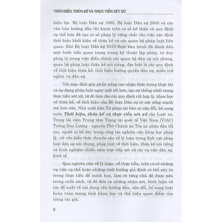 Trong xu thế hội nhập và phát triển, để các quan hệ dân sự phát huy được tác dụng tích cực, góp phần thúc đẩy xã hội phát triển lành mạnh thì phải tạo sự ổn định cho các quan hệ dân sự, từ đó tạo tâm lý yên tâm cho các chủ thể trong giao lưu dân sự. Do đó, pháp luật quy định các thời hạn để các bên có thể lựa chọn cách xử sự cho phù hợp vì lợi ích của mình. Khi kết thúc thòi hạn đó trong những điều kiện theo luật định có thể làm phát sinh hay chấm dứt quyền, nghĩa vụ của những chủ thể có liên quan. Thời hạn đó được gọi là thời hiệu.Qua thực tiễn xét xử cho thấy, việc hiểu và áp dụng các quy định của pháp luật về thời hiệu trong các vụ việc dân sự nói chung, tranh chấp về thừa kế nói riêng đang còn có những quan điểm, ý kiến khác nhau. Cũng vì nguyên nhân này mà có một số vụ việc đường lối giải quyết của các cấp Tòa án không thông nhất, phải xét xử nhiều lần, gây nhiều tốn kém cả về thời gian, công sức, tiền bạc cho cơ quan tiến hành tố tụng cũng như người dân, nhất là đối với những vụ việc thừa kê mà thời điểm mở thừa kế đã diễn ra nhiều năm trước, khi pháp luật có sự thay đổi, các quan hệ đã có nhiều biến động, việc thu thập tài liệu, chứng cứ gặp nhiều khó khán...Pháp lệnh Thừa kế 1990 lần đầu tiên đã quy định về thời hiệu thừa kế, là cơ sở cho việc tính thời hiệu thừa kế của các vụ việc đã mở trước, trong và sau khi Pháp lệnh này có hiệu lực. Bộ luật Dân sự 1995, Bộ luật Dân sự 2005 và các văn bản hướng dẫn thi hành trên cơ sở kế thừa và quy định cụ thể hơn đã tạo cơ sở pháp lý vững chắc cho việc xác định thời hiệu khởi kiện về thừa kế và các quan hệ pháp luật liên quan. Khi Bộ luật Dân sự 2015 được ban hành đã đánh dấu một bước tiến quan trọng trong kỹ thuật lập pháp, tư duy pháp lý trong việc điều chỉnh các quan hệ dân sự nói chung, quan hệ pháp luật thừa kế nói riêng, đặc biệt là các quy định về thời hiệu thừa kế, thời hiệu hưởng quyền dân sự, miễn trừ nghĩa vụ dân sự.Với mục đích góp phần nâng cao nhận thức trong thực thi và áp dụng pháp luật ngày một tốt hơn, tạo sự thống nhất trong thực tiễn xét xử, từ đó làm cho các quy định rất hợp lý, khoa học về thừa kế, về thời hiệu của Bộ luật Dân sự có sức sống mạnh mẽ hơn nữa, Nhà xuất bản Tư pháp tái bản có sửa đổi, bổ sung cuốh Thời hiệu, thừa kế và thực tiễn xét xử của Luật sư, Trọng tài viên Trung tâm Trọng tài quốc tế Việt Nam (VIAC) Tưởng Duy Lượng - nguyên Phó Chánh án Tòa án nhân dân tối cao, người có bề dày trong công tác nghiên cứu khoa học pháp lý, với vốn kiến thức chuyên sâu về lý luận trong lĩnh vực pháp luật dân sự nói chung, pháp luật về thời hiệu, thừa kế nói riêng và kinh nghiệm nhiều năm trực tiếp xét xử các vụ việc dân sự, kinh tế.Qua nghiên cứu về lý luận, về thực tiễn, trên cơ sở những vụ việc cụ thể hoặc những tình huống giả định có thể xảy ra trong thực tiễn để minh họa, làm rõ từng chủ đề được nêu trong cuốn sách, từ đó đưa ra những nhận xét, bình luận và các đề xuất về nội dung cần hướng dẫn, sửa đổi, bổ sung luật hoàn toàn mang tính khoa học và thể hiện quan điểm của riêng tác giả.