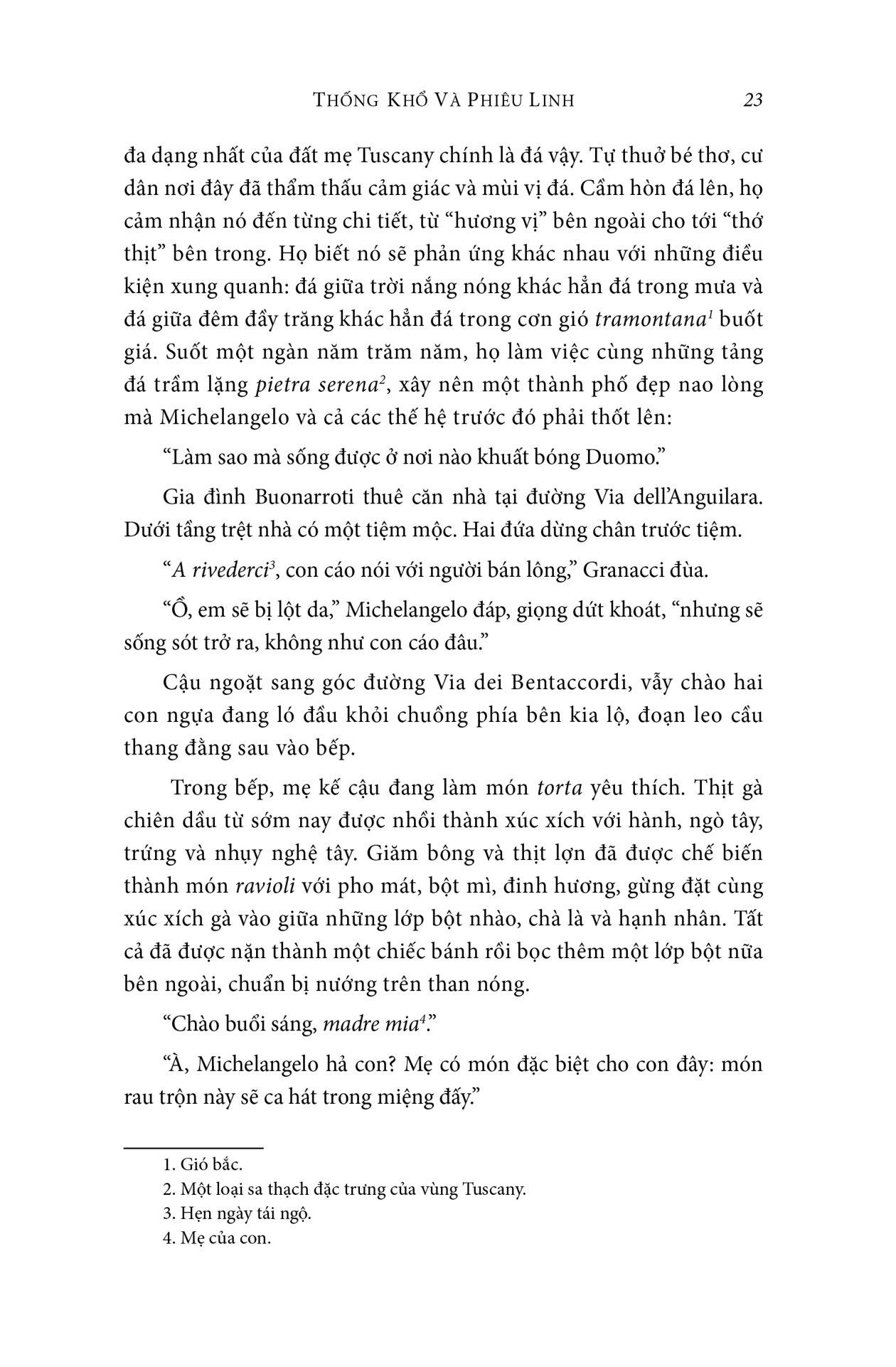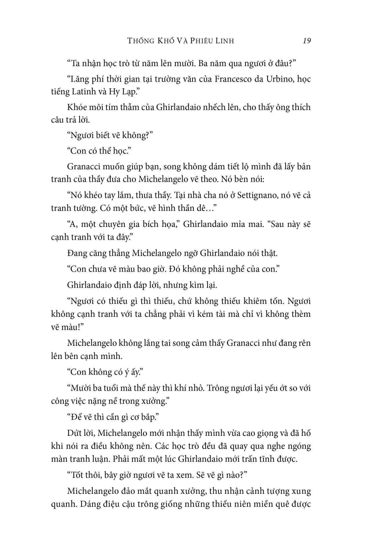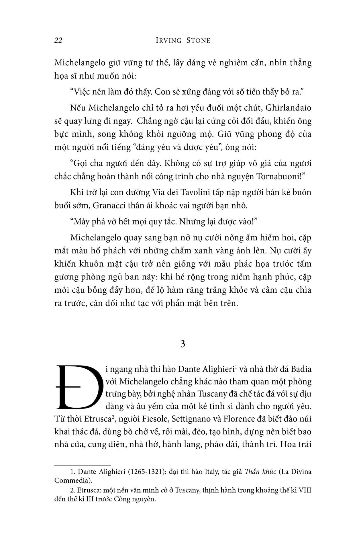 “Tiểu thuyết hóa cuộc đời của Michelangelo Buonarroti, nghệ sĩ nổi tiếng mọi thời đại với nhiều công trình sáng tạo bất tử, tác phẩm đã đưa chúng ta xuyên qua thời Phục hưng, đến với hành trình kì vĩ và ngặt nghèo của người nghệ sĩ nỗ lực tìm đường sống cho m.ình bất chấp mọi khó khăn, thách thức.” - Bookwormex