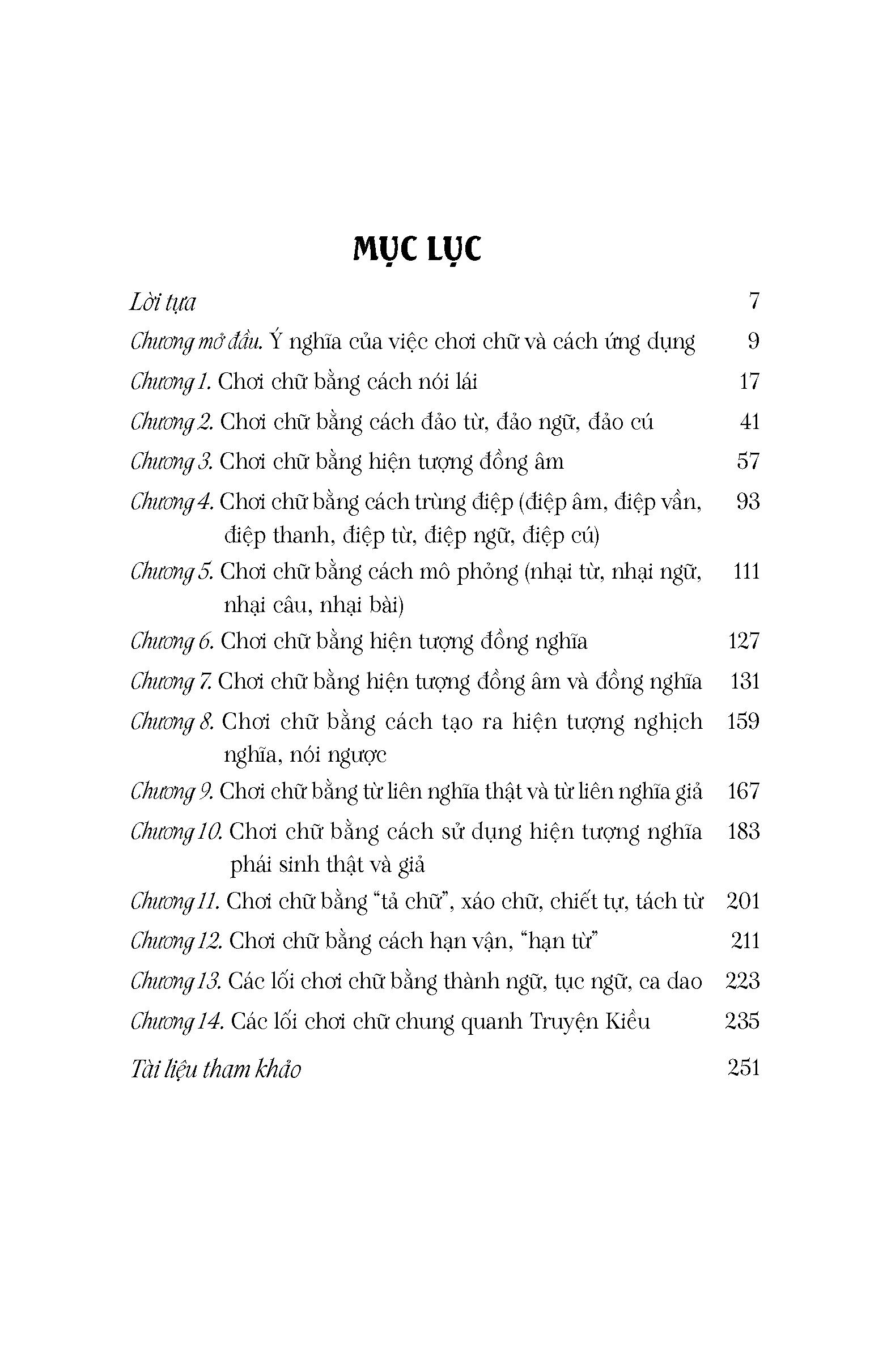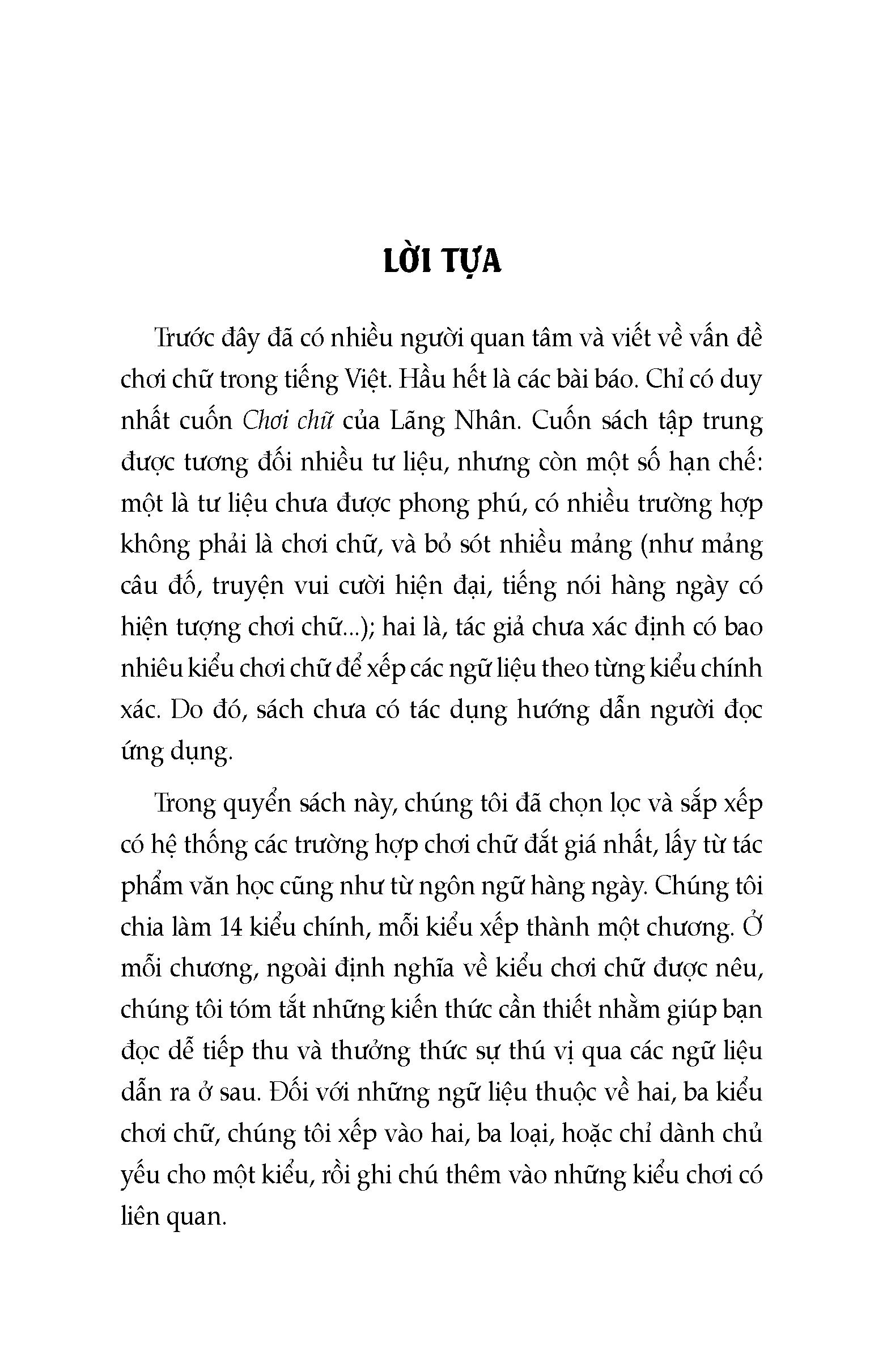 Trong quyển sách này, chúng tôi đã chọn lọc và sắp xếp có hệ thống các trường hợp chơi chữ đắt giá nhất, lấy từ tác phẩm văn học cũng như từ ngôn ngữ hàng ngày. Chúng tôi chia làm 14 kiểu chính, mỗi kiểu xếp thành một chương. Ở mỗi chương, ngoài định nghĩa về kiểu chơi chữ được nêu, chúng tôi tóm tắt những kiến thức cần thiết nhằm giúp bạn đọc dễ tiếp thu và thưởng thức sự thú vị qua các ngữ liệu dẫn ra ở sau. Đối với những ngữ liệu thuộc về hai, ba kiểu chơi chữ, chúng tôi xếp vào hai, ba loại, hoặc chỉ dành chủ yếu cho một kiểu, rồi ghi chú thêm vào những kiểu chơi có liên quan.