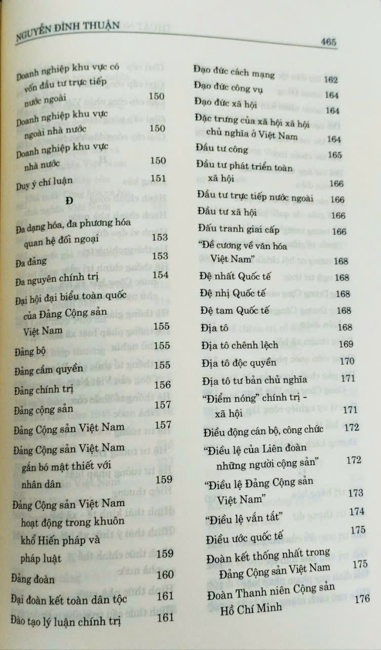 Với mục đích trang bị những kiến thức cơ bản về lĩnh vực lý luận chính trị, xây dựng công cụ tra cứu phục vụ quá trình học tập và nghiên cứu của bạn đọc, với cách trình bày có hệ thống, cuốn sách Thuật ngữ lý luận chính trị của TS. Nguyễn Đình Thuận -Hiệu trưởng Trường Chính Trị Đà Nẵng đã giải thích thông tin về các thuật ngữ lý luận chính trị theo hướng ngắn gọn, dễ hiểu các mục từ cơ bản về các quan điểm, chủ trương của Đảng, chính sách, pháp luật của Nhà nước, các từ thông dụng trong các ngành lý luận chính trị như triết học Mác - Lênin, kinh tế chính trị Mác - Lênin, chủ nghĩa xã hội khoa học, về hệ thống chính trị, nhà nước và pháp luật…