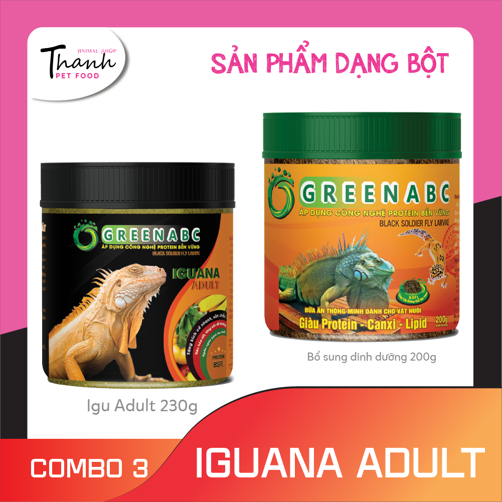 GREENABC là thức ăn cao cấp dành cho Iguana Trưởng Thành - Rồng Nam Mỹ Trưởng Thành. Đặc biệt sản phẩm GREENABC được sản xuất theo phương pháp Áp dụng công nghệ PROTEIN bền vững từ bột đạm G.Meal rất giàu PROTEIN – CANXI – LIPID có trong BSFL, đã được Mỹ (AAFCO) và EU chấp nhận đưa vào công thức cho ngành sản xuất thức ăn dành cho vật nuôi.