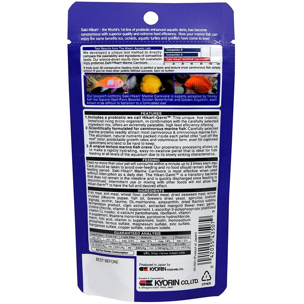 - SAKI-HIKARI MARINE CARNIVOREvà SAKI-HIKARI MARINE HERBIVORE bao gồm một loại vi khuẩn được thiết kế dành riêng cho thức ăn cho cá có tên là Hikari-Germ và được đóng gói với nhiều loại protein được lựa chọn cẩn thận.