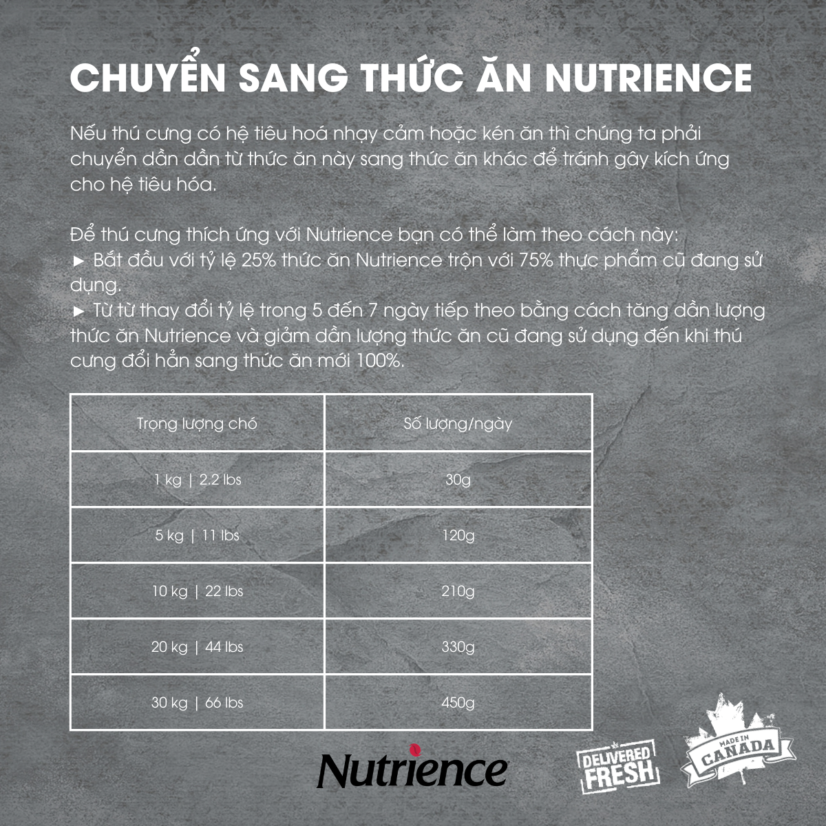 - Điều quan trọng là phải chuyển dần dần con chó con của bạn từ thức ăn này sang thức ăn khác để tránh gây kích ứng cho hệ tiêu hóa ở chó con. Bắt đầu với tỷ lệ 25% thức ăn Nutrience trộn với 75% thực phẩm cũ đang sử dụng. Từ từ thay đổi tỷ lệ trong 5 đến 7 ngày tiếp theo bằng cách tăng dần lượng thức ăn Nutrience và giảm dần lượng thức ăn cũ đang sử dụng. Trọng lượng số lượng / ngày