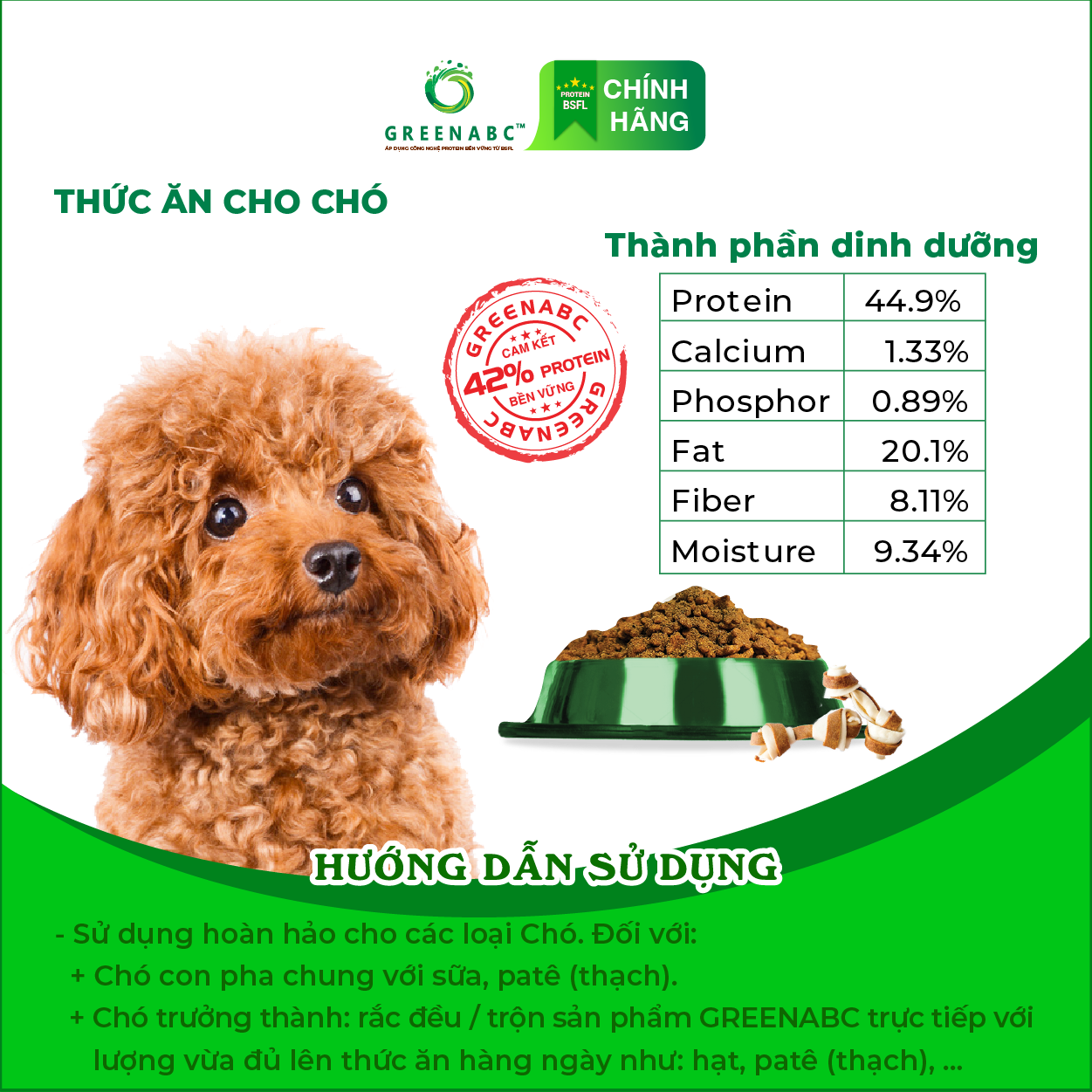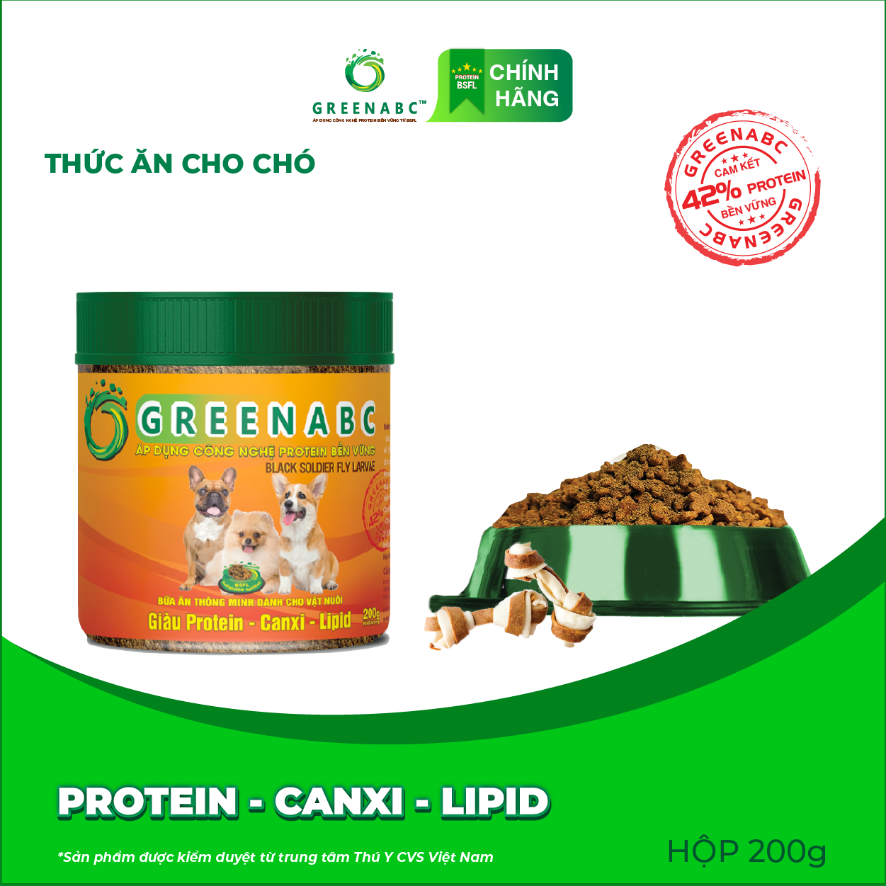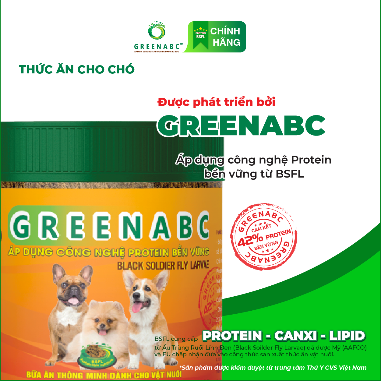 GREENABC là thức ăn cao cấp dành cho các loại chó. Đặc biệt sản phẩm GREENABC được sản xuất theo phương pháp Áp dụng công nghệ PROTEIN BỀN VỮNG từ bột đạm G.Meal rất giàu PROTEIN–CANXI–LIPID có trong BSFL*, đã được Mỹ (AAFCO) và EU chấp nhận đưa vào công thức cho ngành sản xuất thức ăn dành cho thú cưng.