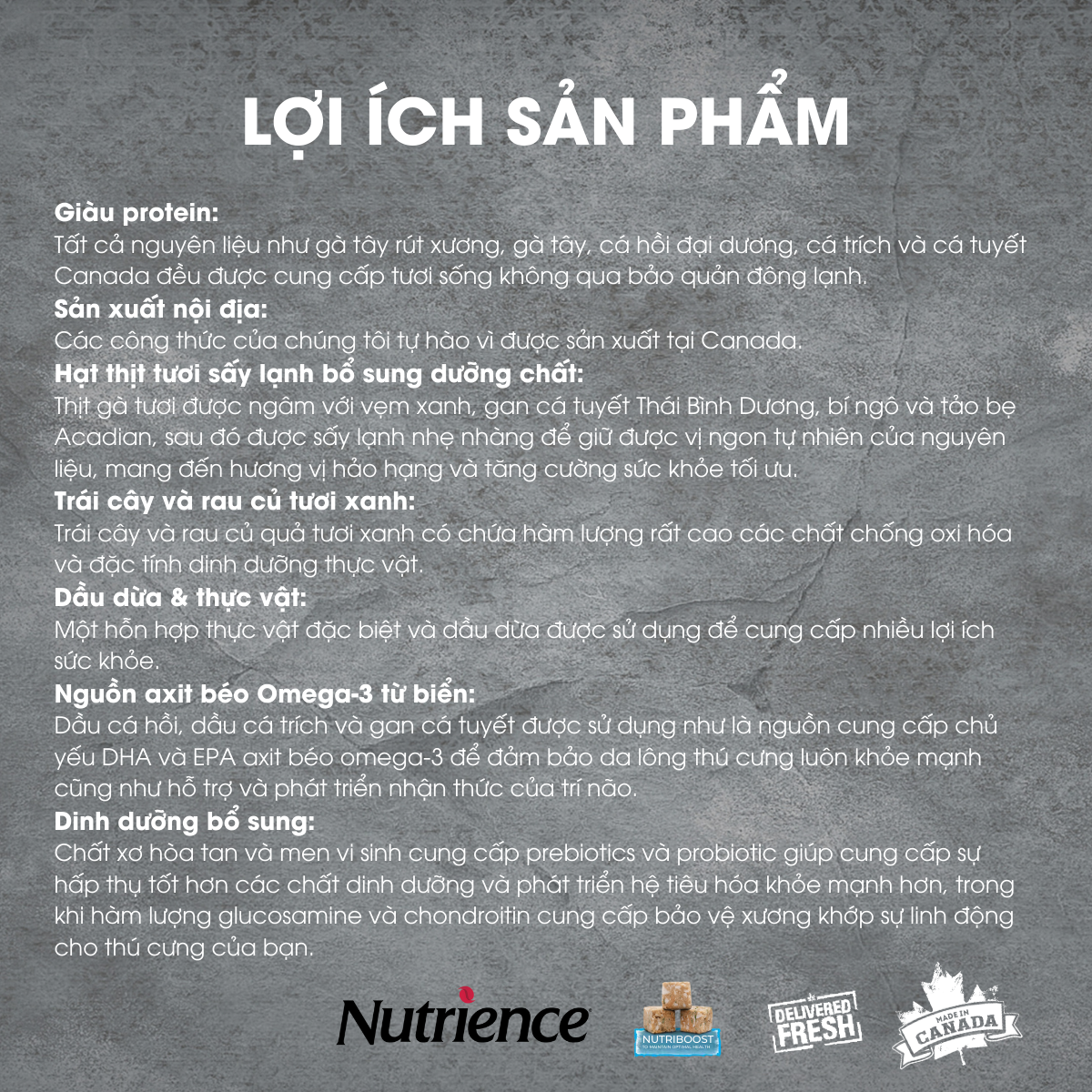 Tất cả nguyên liệu như gà tây rút xương, gà tây, cá hồi đại dương, cá trích và cá tuyết Canada đều được cung cấp tươi sống không qua bảo quản đông lạnh.