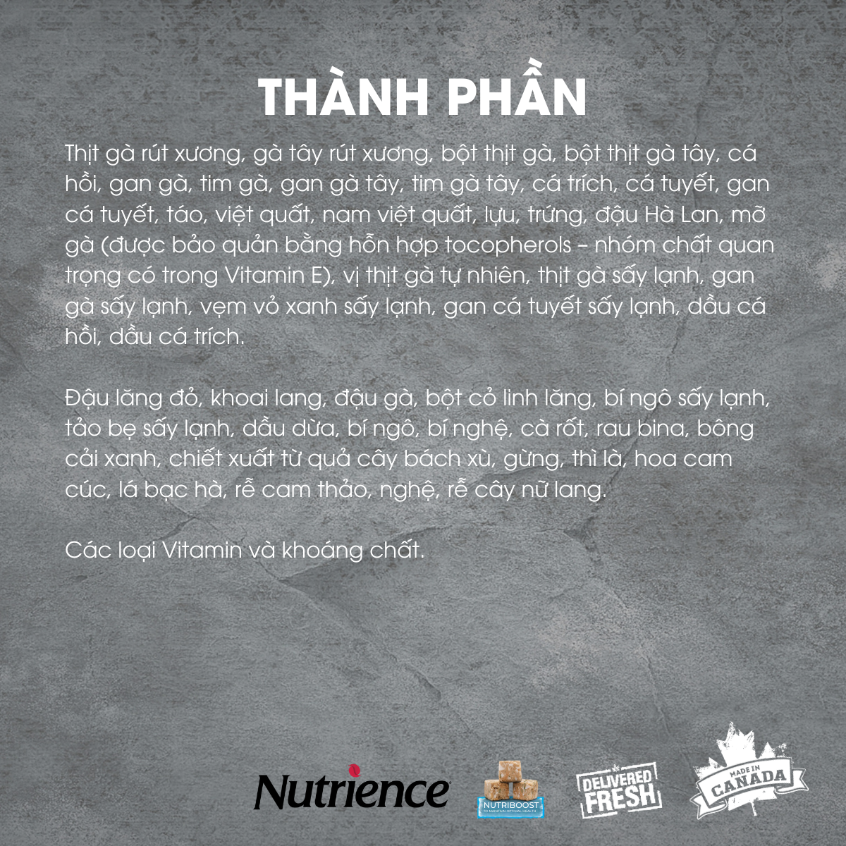 - THÀNH PHẦN NGUYÊN LIỆU: Thịt gà rút xương, gà tây rút xương, bột thịt gà, bột thịt gà tây, cá hồi, gan gà, tim gà, gan gà tây, tim gà tây, cá trích, cá tuyết, gan cá tuyết, trứng, đậu Hà Lan, mỡ gà (được bảo quản bằng hỗn hợp tocopherols – nhóm chất quan trọng có trong Vitamin E), đậu lăng đỏ, khoai lang, đậu gà, vị thịt gà tự nhiên, bột cỏ linh lăng, thịt gà sấy đông lạnh, bí ngô sấy đông lạnh, gan gà sấy đông lạnh, vẹm vỏ xanh sấy đông lạnh, gan cá tuyết sấy đông lạnh, tảo bẹ sấy đông lạnh, dầu cá hồi, dầu cá trích, dầu dừa, bí ngô, bí nghệ, cà rốt, rau bina, bông cải xanh, táo, việt quất, nam việt quất, lựu, chiết xuất từ quả cây bách xù, gừng, thì là, hoa cam cúc, lá bạc hà, rễ cam thảo, nghệ, rễ cây nữ lang, Vitamin tổng hợp Xuất xứ Canada HSD: 12 tháng từ ngày sản xuất trên bao bì