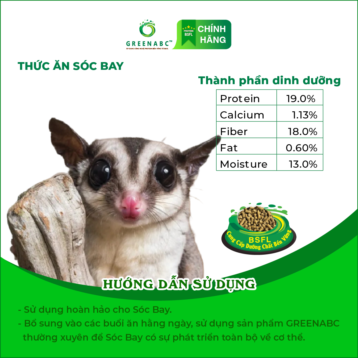 Mua tại TiktokGREENABC - THỨC ĂN SÓC BAY - LÔNG MƯỢT, TĂNG CƯỜNG SỨC KHỎE GREENABC là thức ăn cao cấp dành cho SÓC BAY. Đặc biệt sản phẩm GREENABC được sản xuất theo phương pháp Áp dụng công nghệ PROTEIN bền vững rất giàu PROTEIN – CANXI – LIPID có trong BSFL, đã được Mỹ (AAFCO) và EU chấp nhận đưa vào công thức cho ngành sản xuất thức ăn cho vật nuôi. Sản phẩm GREENABC cung cấp cácgiá trị dinh dưỡng bền vững cho thú cưng, giúp cho Sóc Bay: