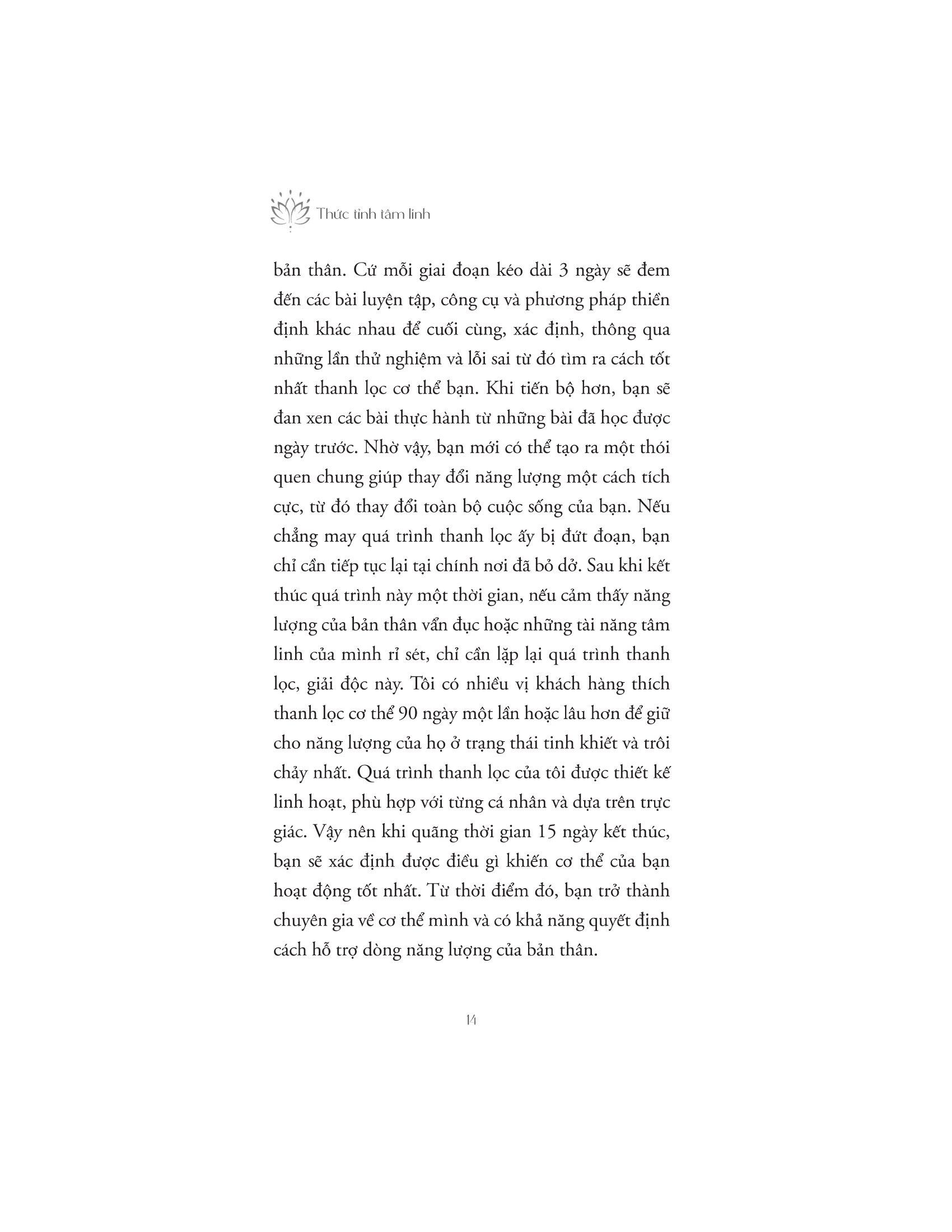 Sau nhiều năm thực hiện công việc tư vấn và chữa lành cho hàng nghìn khách hàng khác nhau, tác giả Oliver Niño đã đúc kết các kinh nghiệm sử dụng thiền, khai mở luân xa và nâng cao tần số rung cảm để cải thiện sức khỏe và cuộc sống của m.ình thành một bảng hướng dẫn chi tiết nhất về quá trình tự chữa lành và khai phá tiềm năng của bản thân chỉ trong 15 ngày. Cuốn sách này sẽ hướng dẫn chi tiết cách tìm kiếm gốc rễ của những vấn đề đang kìm kẹp bạn, hay chính là những cảm xúc tiêu cực, những ám ảnh trong quá khứ, thậm chí chúng có thể bắt nguồn từ thời ông bà của bạn di truyền lại; sau đó học cách bảo vệ tâm trí khỏi những ký ức này và từng bước sống tích cực để duy trì một trường năng lượng cao hơn. Ở tần số năng lượng cao, bạn có thể chữa lành bản thân cũng như kêu gọi một tương lai tươi sáng hơn cùng với những con người, sự việc có chung mức tần số cao đó.