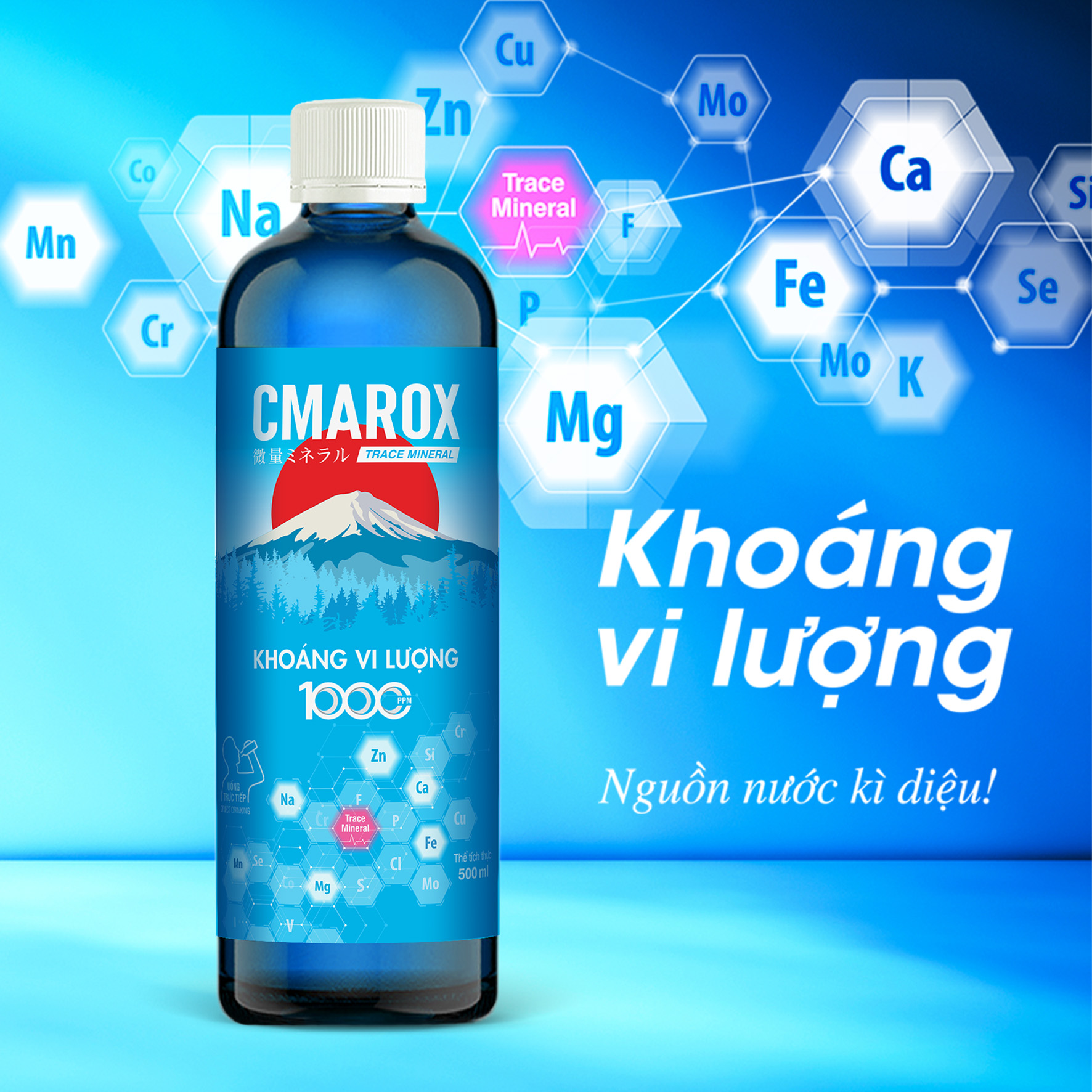 CMAROX CHAI 500ml với nồng độ khoáng vi lượng 1.000ppm CMAROX chứa hơn 36 loại khoáng chất vi lượng thiết yếu ở dạng ion, cần thiết cho việc duy trì sức khỏe của con người