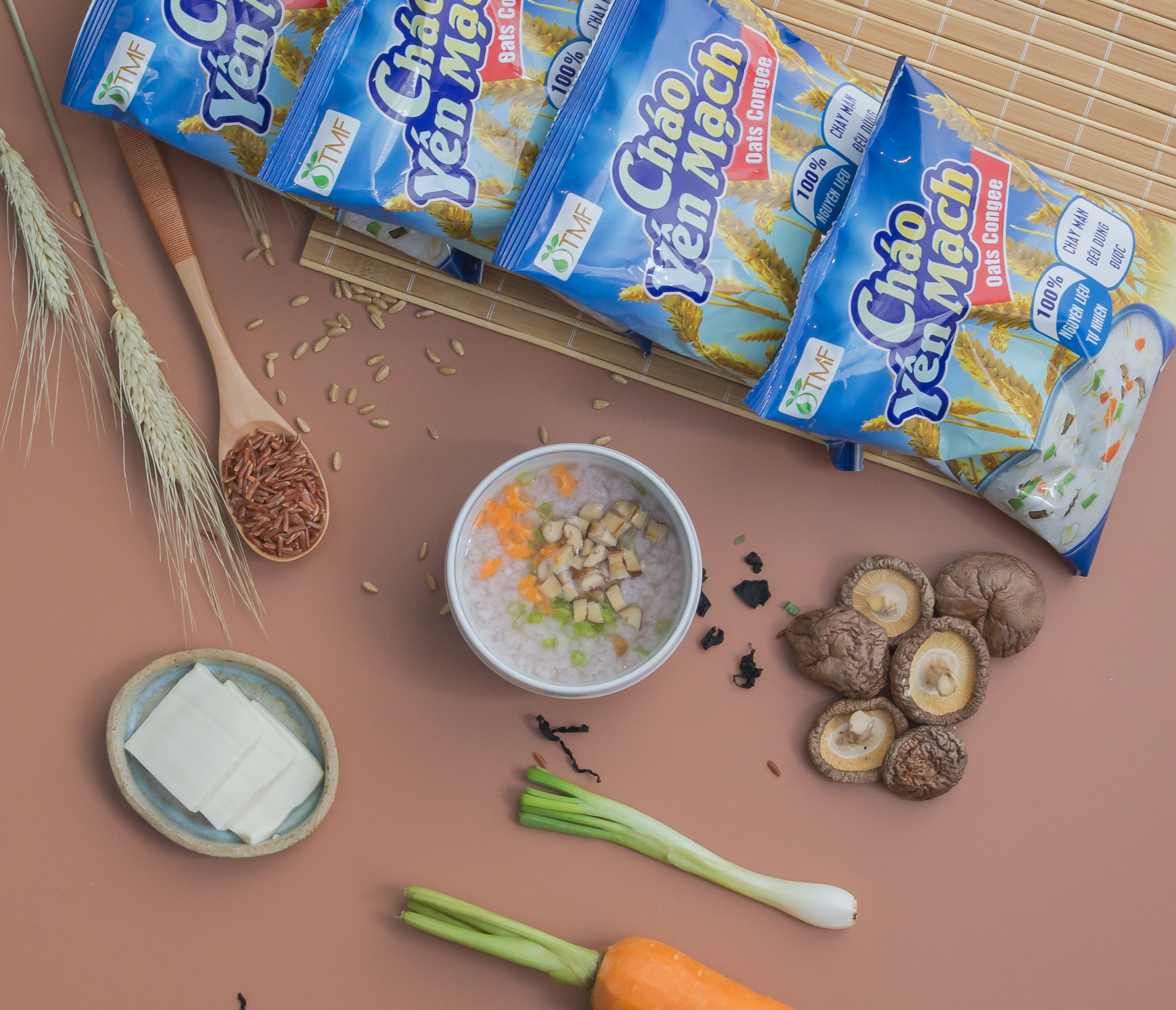 Thành phần: Yến mạch (50%), gạo lứt (40%), củ ngưu báng, nấm đông cô, cà rốt, gia vị: muối, hành, tiêu