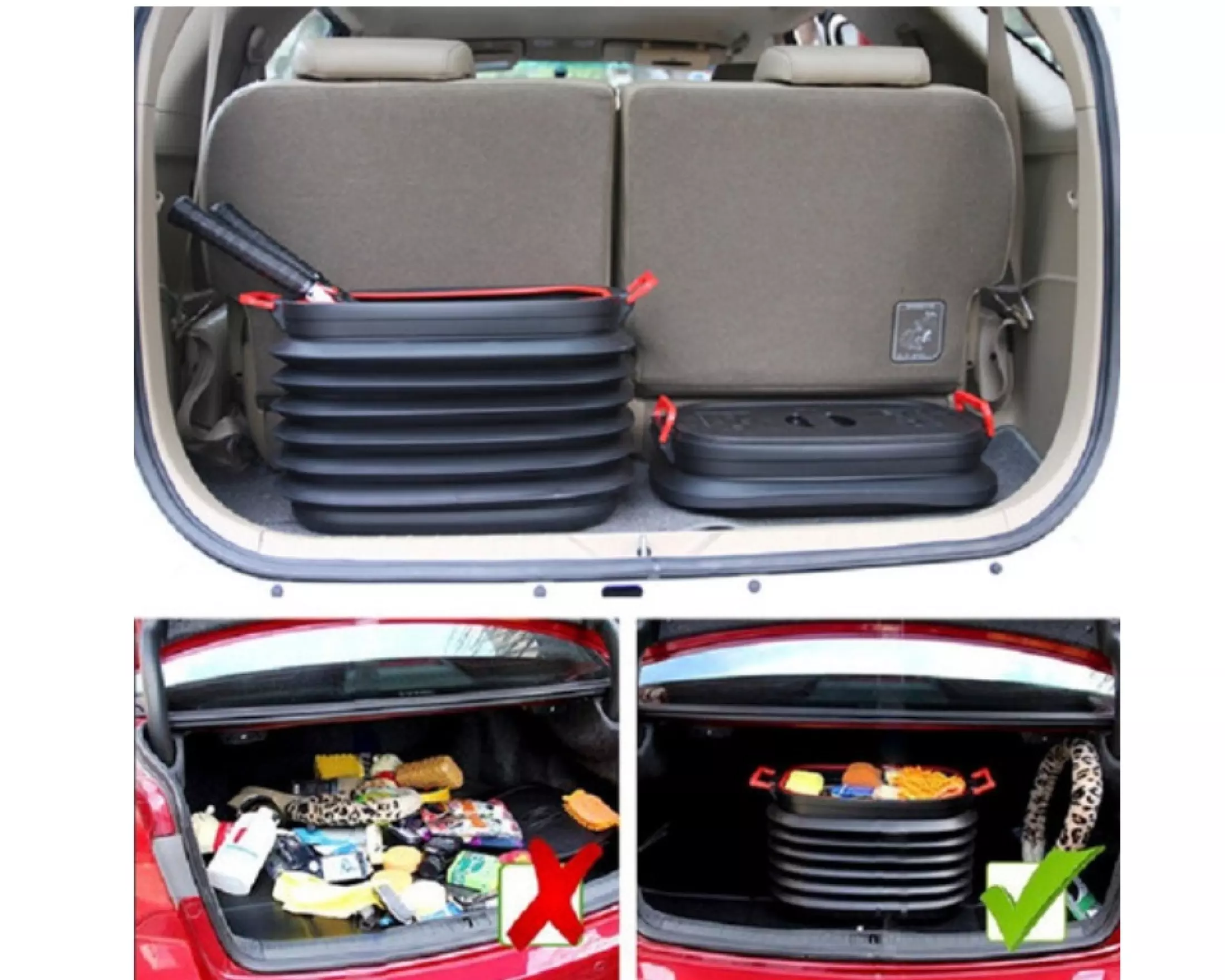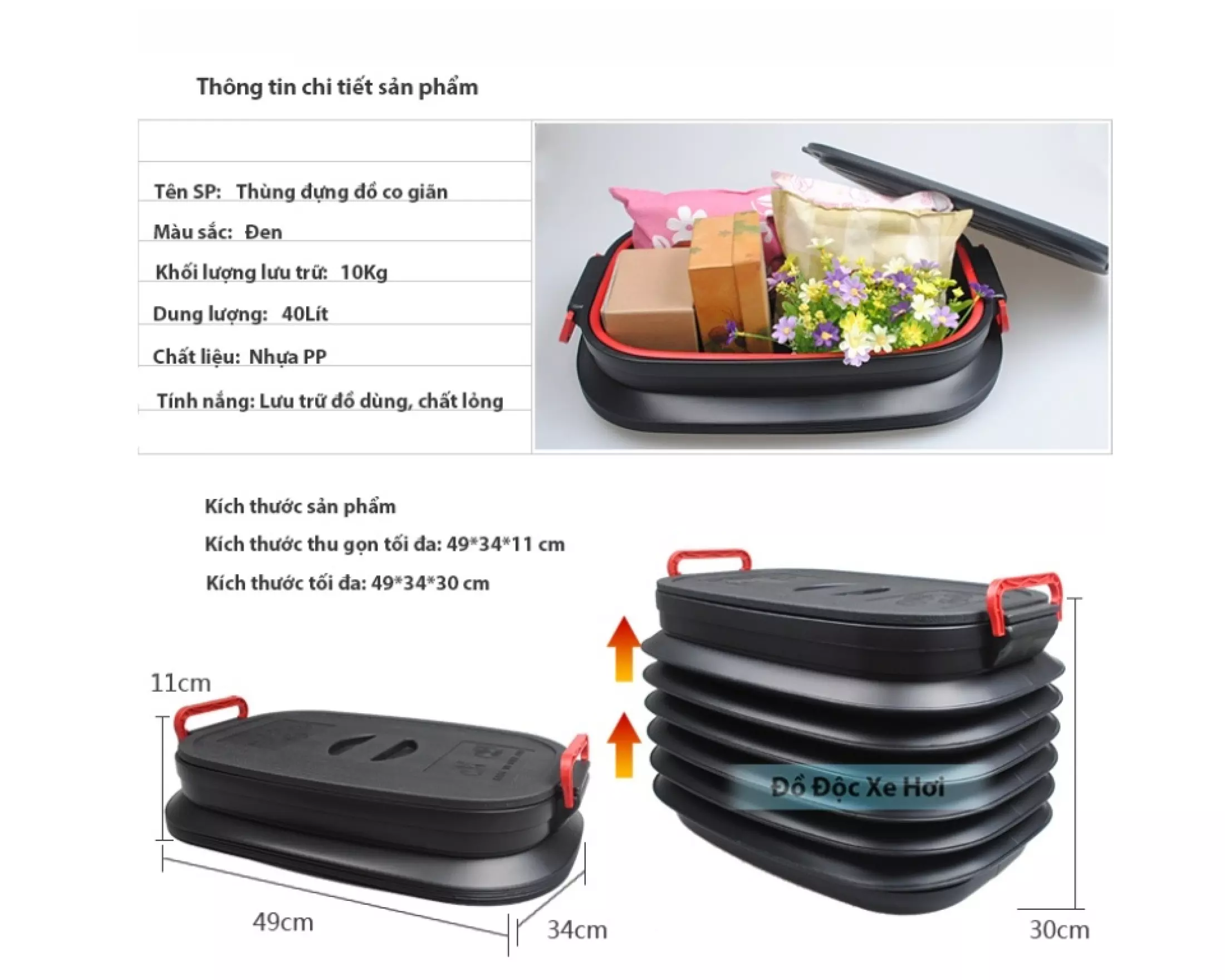 – Không tốn diện tích, không cồng kềnh, thùng đựng đồ nhựa có khả năng thu nhỏ tối đa với kích thước 11×30 cm, bạn có thể cất gọn ở bất kỳ đâu: gầm ghế ô tô, cốp ô tô, sau cánh cửa, ngăn tủ.