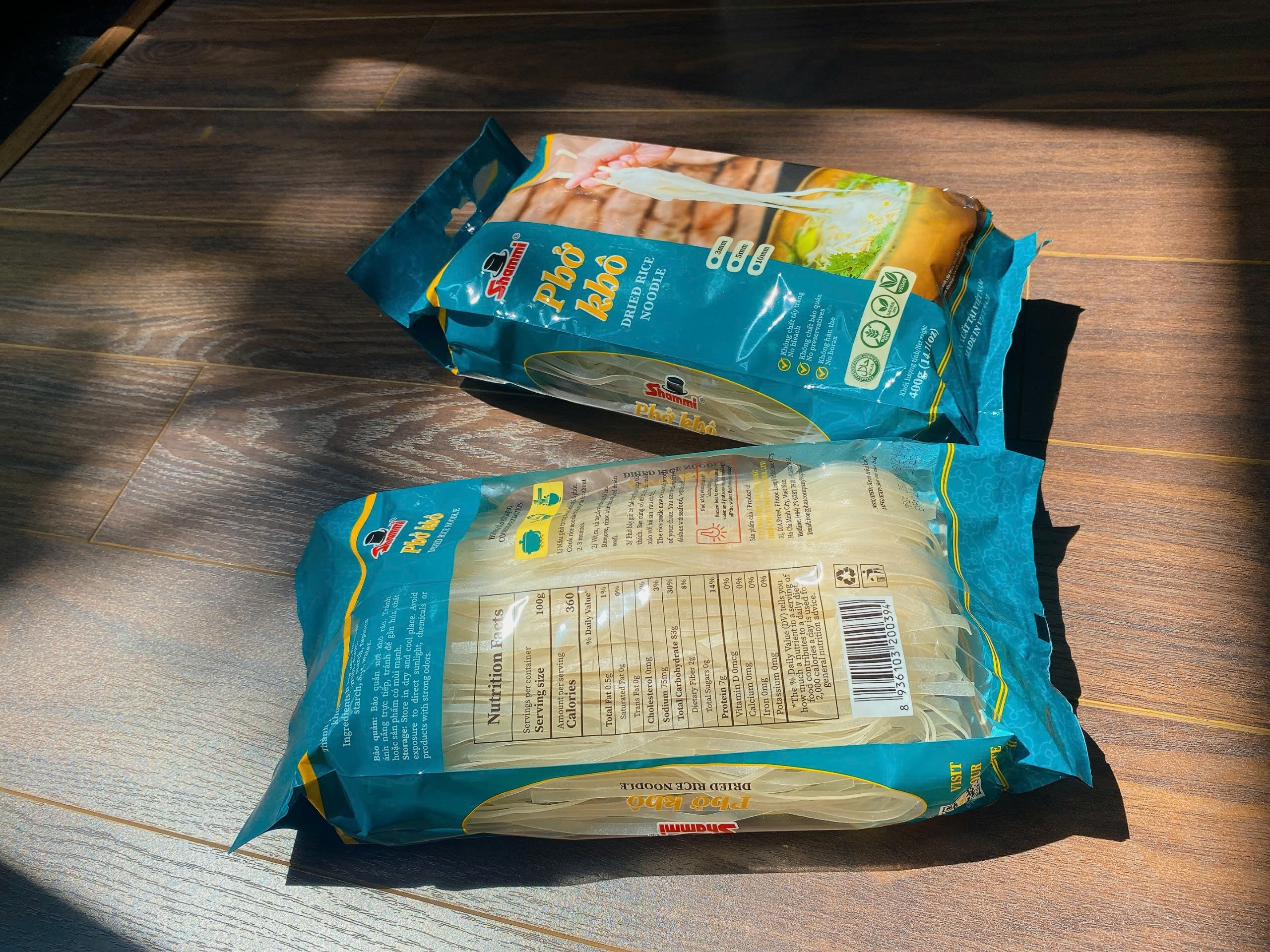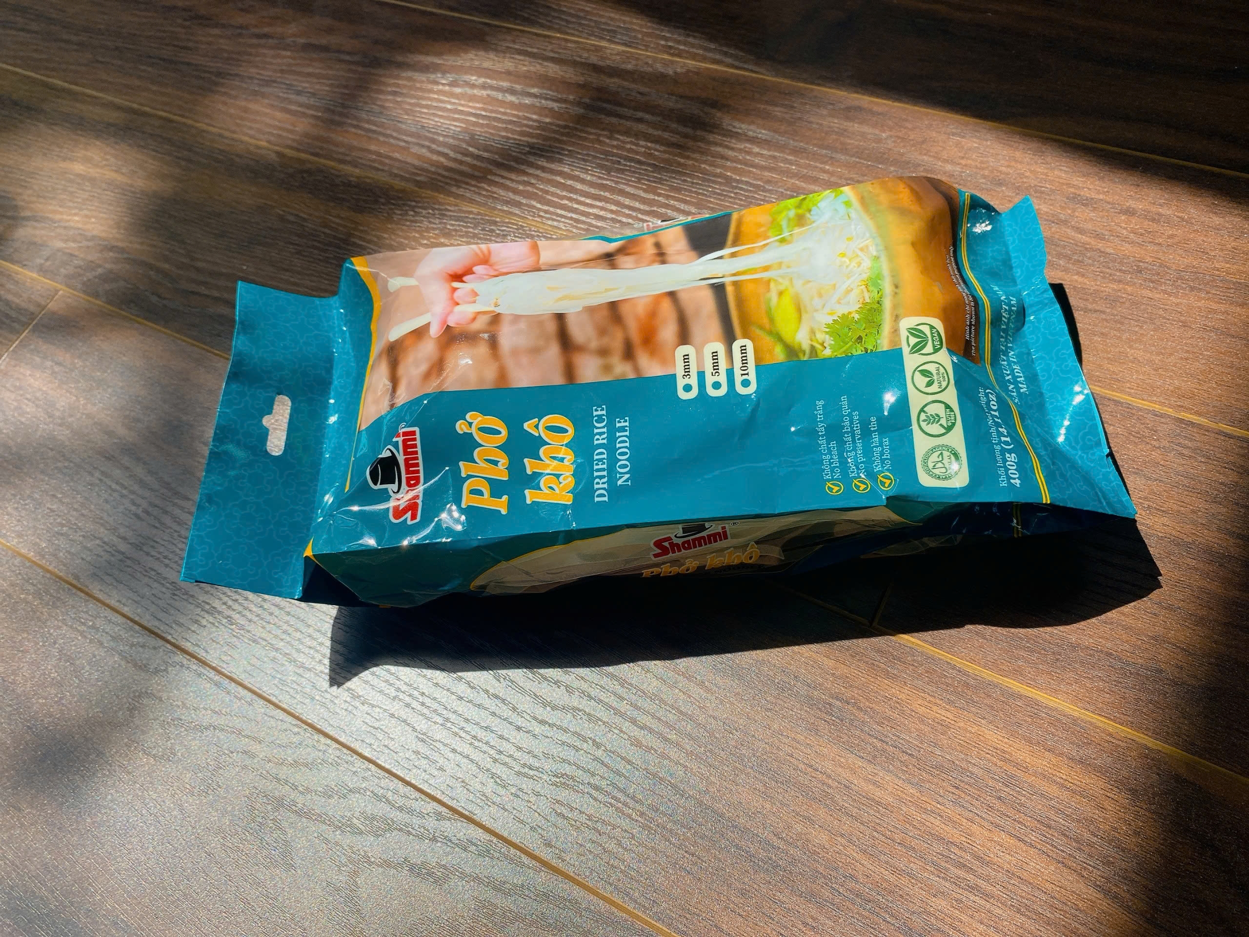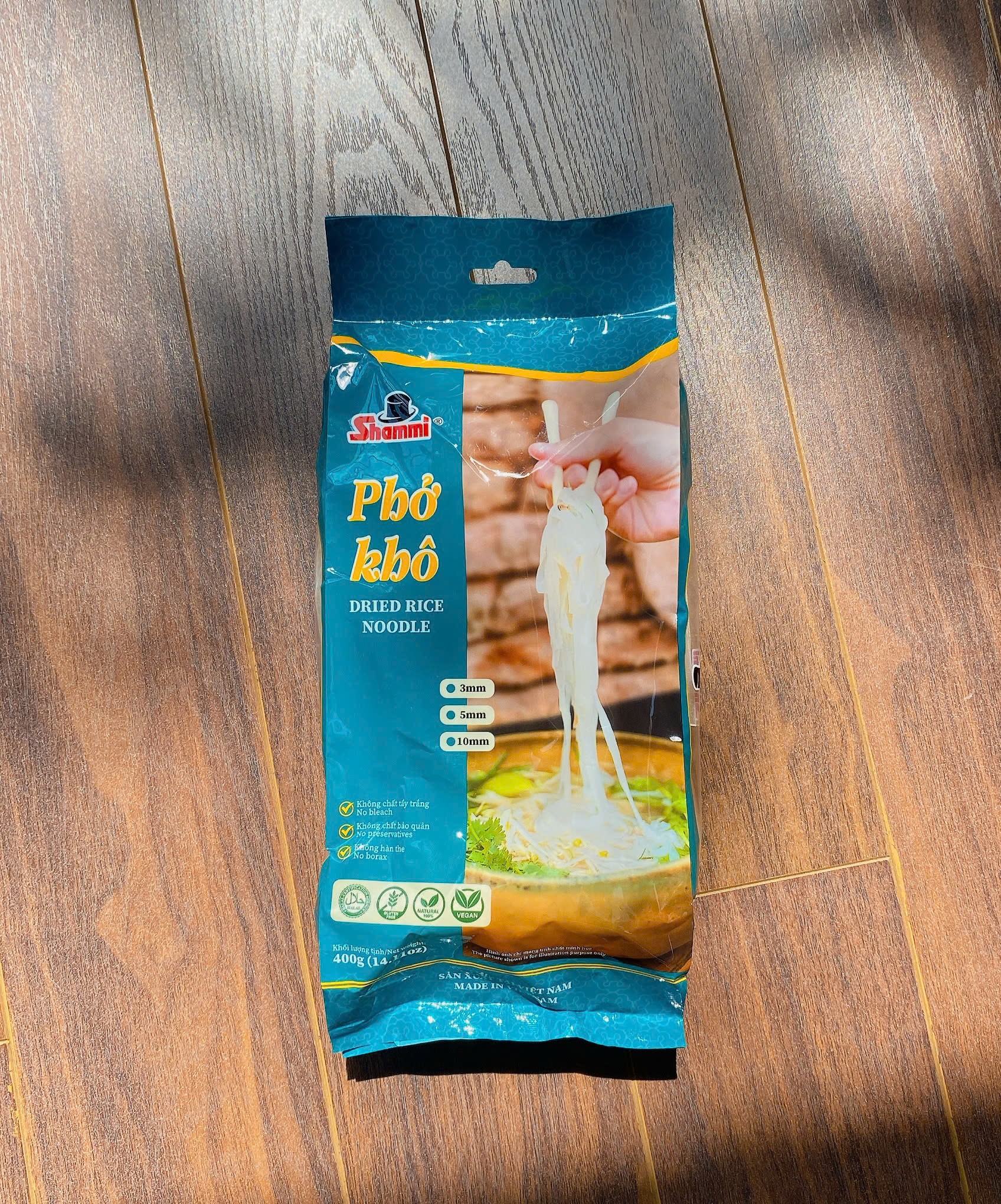 Sợi phở dai dai, bùi bùi, màu trắng chuẩn vị sợi phở Việt Nam được làm từ 100% nguyên liệu tự nhiên chất lượng, đảm bảo an toàn. Phở khô Shammi gói 400g giúp bạn bảo quản được lâu. Phở khô có thể dùng để chế biến đa dạng các món ăn như xào hoặc nấu với nước lèo tùy thích một cách đơn giản.