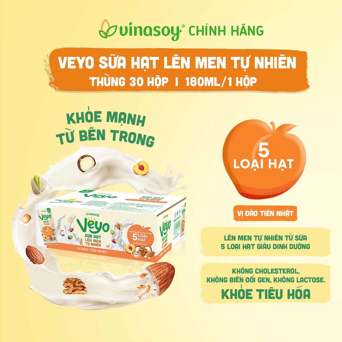 - VEYO SỮA HẠT 5 LOẠI CAO CẤP nguồn dinh dưỡng trọn vẹn từ ÓC CHÓ, HẠNH NHÂN, MẮC CA, YẾN MẠCH, DẺ CƯỜI mang đến vị ngọt dịu nhẹ, bùi béo tự nhiên, hòa
