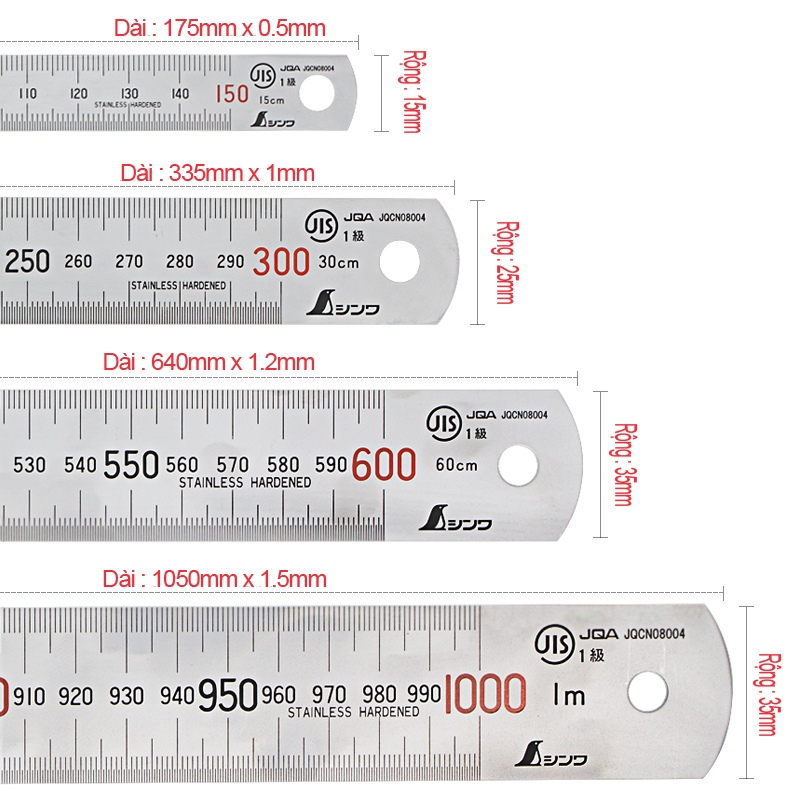 - Thước thẳng inox mạ nhũ bạc Shinwa gồm các loại thước có chiều dài : 15cm, 30cm, 60cm, 1m, 2m. Thước được khắc trên bề mặt thép cứng không gỉ giúp cho thước không bị mất vạch kẻ. Độ chính xác đạt chuẩn của Nhật. Thước lá inox và thước lá inox được nhũ bạc đặc điểm khác nhau nằm ở chỗ, thước được mài bóng và sau đó được nhũ bạc lên bề mặt của thước, giúp thước trong đẹp hơn rất nhiều so với thước lá inox.