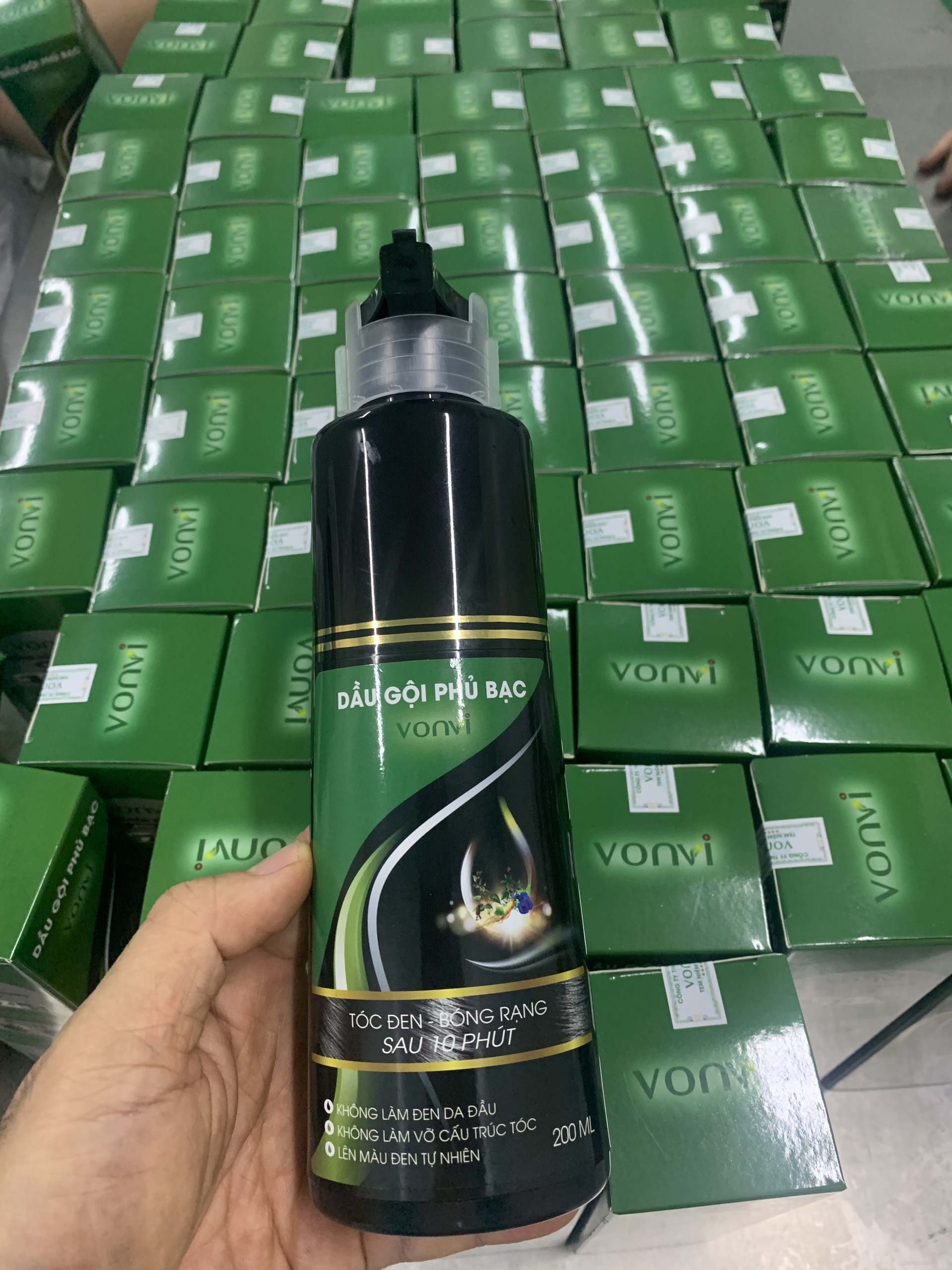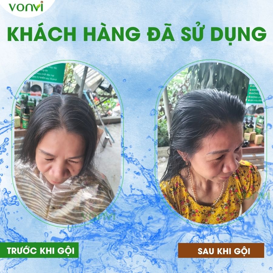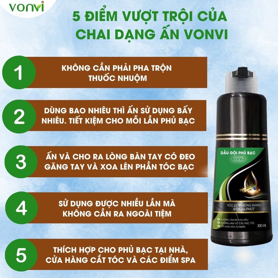BẠN ĐANG GẶP PHẢI CÁC VẤN ĐỀ SAU: () Mái tóc bạn bị bạc, xơ, phai màu khiến cho bạn nhìn già, xấu hơn so với hội bạn cùng tuổi. () Bận rộn cả ngày không có thời gian rỗi để đến salon làm đẹp cho mái tóc của mình. () Sợ sử dụng các loại t h u ố c nhuộm có chứa các hóa chất gây hại cho mái tóc và da đầu. () Không tự làm đen mái tóc của mình mà lại cần thêm người giúp đỡ mỗi khi gội đen tóc. () Mất tự tin vì bị tóc bạc quá nhiều khi đi họp lớp hoặc nơi đông người. ƯU ĐIỂM VƯỢT TRỘI của dầu gội phủ bạc VONVI dạng chai ấn () KHÔNG Amoniac, KHÔNG cần pha trộn t.h.u.ố.c nhuộm. () KHÔNG gây kích ứng da, KHÔNG làm đen da đầu, KHÔNG gây xót da đầu () KHÔNG làm tổn thương cho tóc và da đầu, KHÔNG làm thay đổi cấu trúc của tóc. () Dạng chai ấn rất tiết kiệm, dùng bao nhiêu thì ấn ra bấy nhiêu. () Sử dụng DỄ DÀNG chỉ cần ẤN và XOA. () KHÔNG cần đến Salon tóc. () Lên màu ĐEN TỰ NHIÊN bóng rạng sau 10 phút. () An toàn cho mọi lứa tuổi. THÀNH PHẦN của dầu gội phủ bạc VONVI làm tóc đen dạng chai ấn () Dầu gội phủ bạc VONVI với thiết kế lược chải thông minh thế hệ mới 1 nút ấn sẽ đem lại cho người dùng sự tiện lợi vô cùng, thao tác nhanh, dễ sử dụng giúp bạn lên màu đều và đẹp chỉ trong vòng 10 phút. () Dầu gội phủ bạc nhà VON #vonvi được chiết xuất từ các loại thảo dược thiên nhiên chính có tác dụng tạo màu tóc và dưỡng tóc như: Hà Thủ Ô, Nhân Sâm, Nấm linh chi, Cỏ mực, Nha đam, Hoa đậu biếc và dầu bơ…. HƯỚNG DẪN SỬ DỤNG dầu gội phủ bạc nhà VONVI làm đen tóc dạng chai ấn () Bước 1: Rút nắp vòng nhựa trắng và nút nhựa đen ở đầu vòi ấn ra. Đeo găng tay trước khi sử dụng sản phẩm. Ấn vòi nhấn xuống để lấy một lượng dầu gội phù hợp ra lòng bàn tay. () Bước 2: Sau đó xoa lượng dầu gội vừa lấy ra lên chỗ tóc bị bạc/trắng, dùng tay xoa đều. Mát xa nhẹ để đảm bảo dầu gội được phủ tới hết các sợi tóc trắng/bạc bên trong mái tóc.  () Bước 3: Ủ tóc trong khoảng thời gian từ 10 tới 15 phút tùy theo số lược tóc bạc/trắng cần phủ bạc. Sau đó xả lại với nước ấm (có thể dùng thêm dầu xả nếu cần), lau khô tóc và lúc này Quý khách đã có 1 mái tóc với màu ĐEN TỰ NHIÊN và bóng mượt. Lắp lại nắp vòng nhựa trắng và nút nhựa đen ở đầu vòi ấn. Cất đi và sử dụng tiếp cho lần sau. THÔNG TIN KHÁC: () Thương hiệu: VONVI () Xuất xứ: Việt Nam. () Màu: ĐEN TỰ NHIÊN () Hạn sử dụng: 03 năm từ ngày sản xuất. () Nếu dầu gội dính ra tay, chán thì lấy khăn ướt lau ngay đi. () Bảo quản sản phẩm ở nơi khô ráo, thoáng mát, tránh ánh nắng trực tiếp.