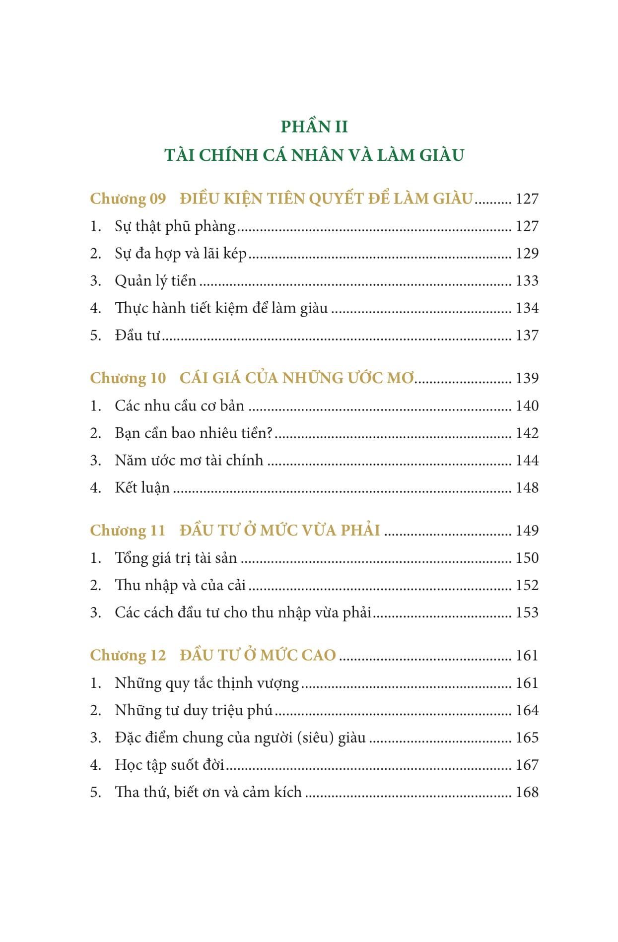 • Phần II – Tài chính cá nhân và Làm giàu: Đây là phần quan trọng của cuốn sách với mục đích chính là truyền đạt những cách làm giàu an toàn. “Giàu” ở đây có ý nghĩa tương đối, không thể hiện bằng một con số cụ thể mà bằng mức độ của sự độc lập tài chính theo nghĩa: Một người đạt được sự độc lập tài chính khi của cải đã tích lũy được có thể sản sinh ra mức thu nhập “đủ” cho mình (và gia đình) sống đến cuối đời mà không cần phải làm việc để kiếm tiền.