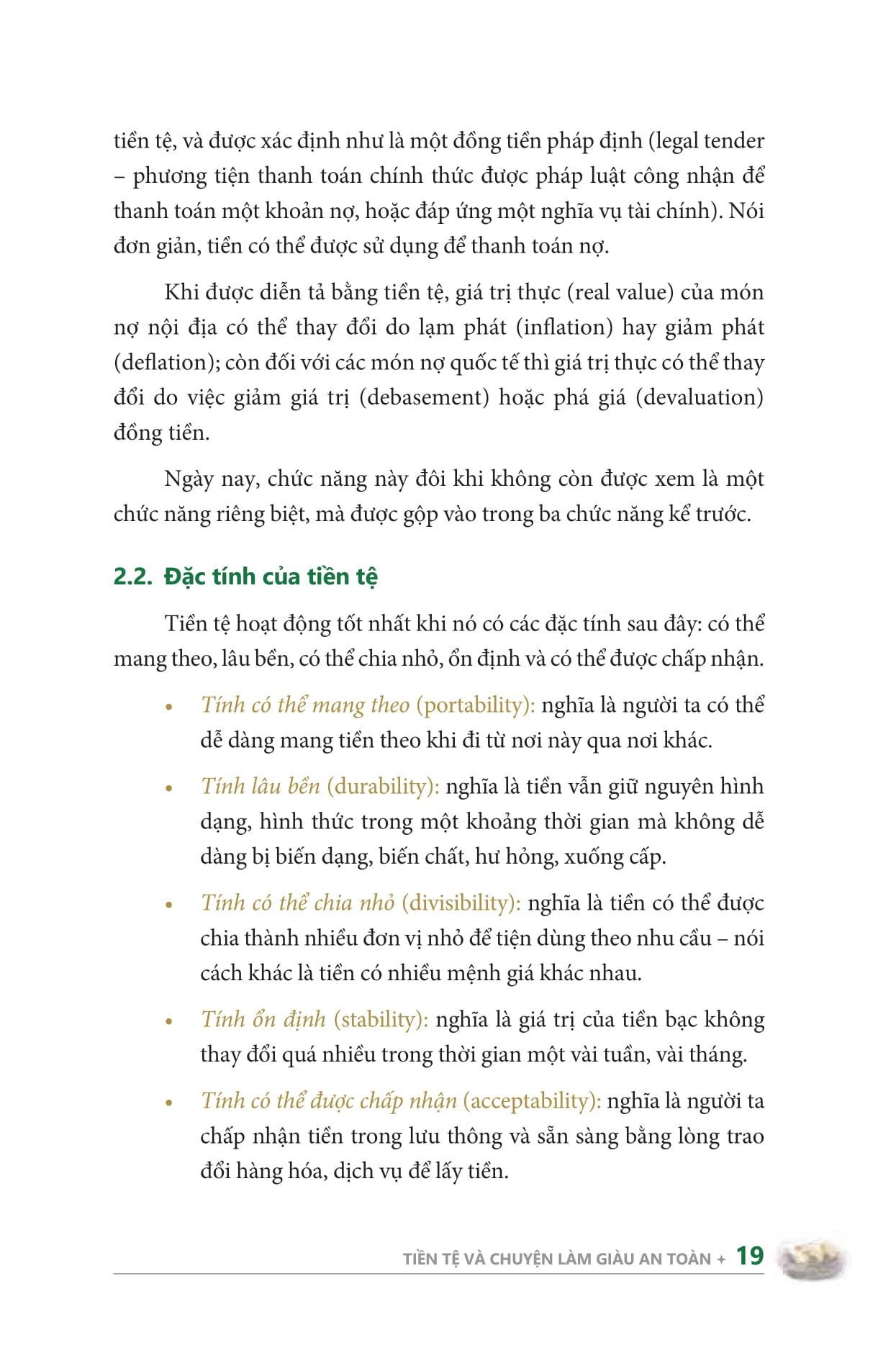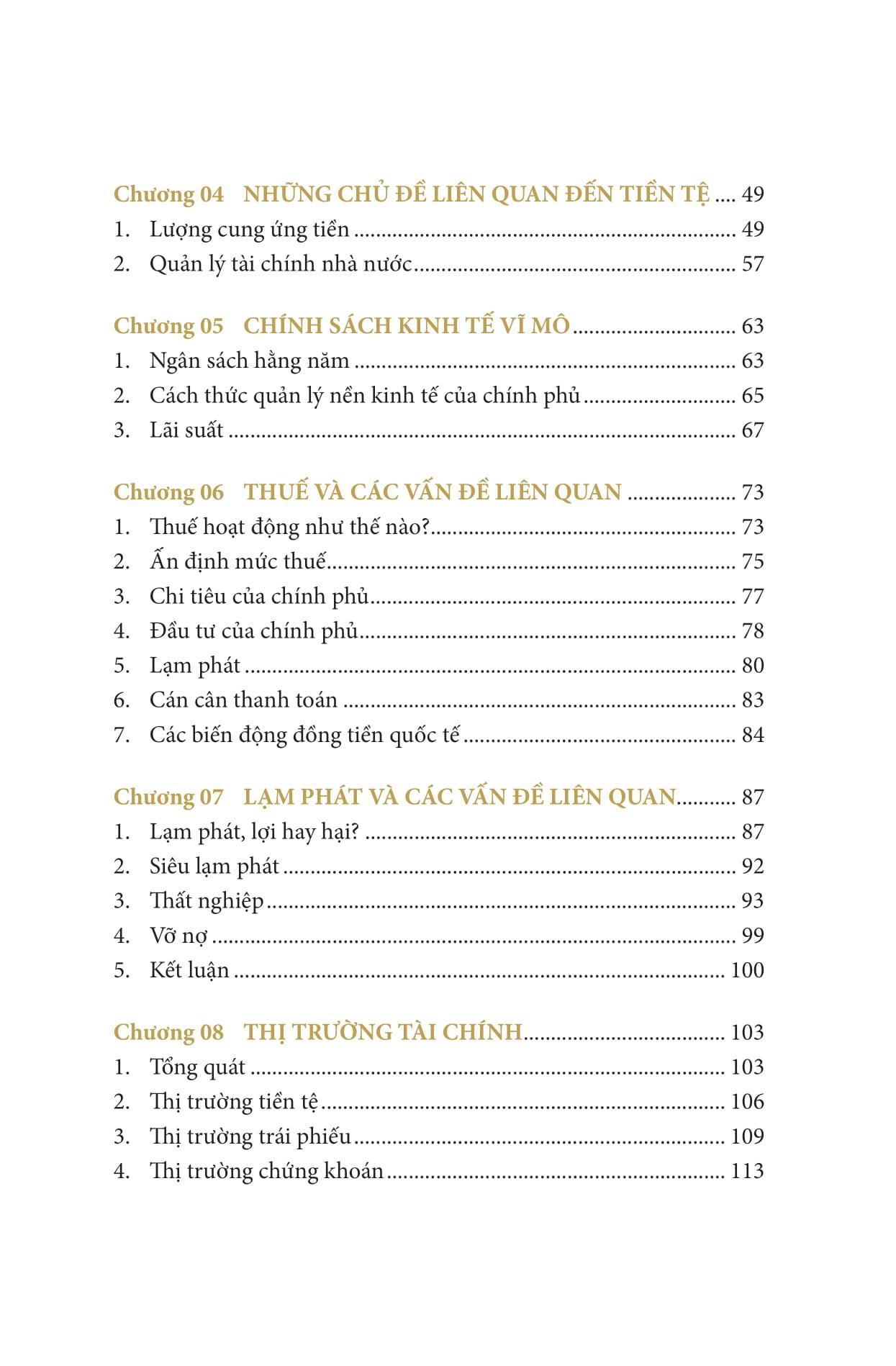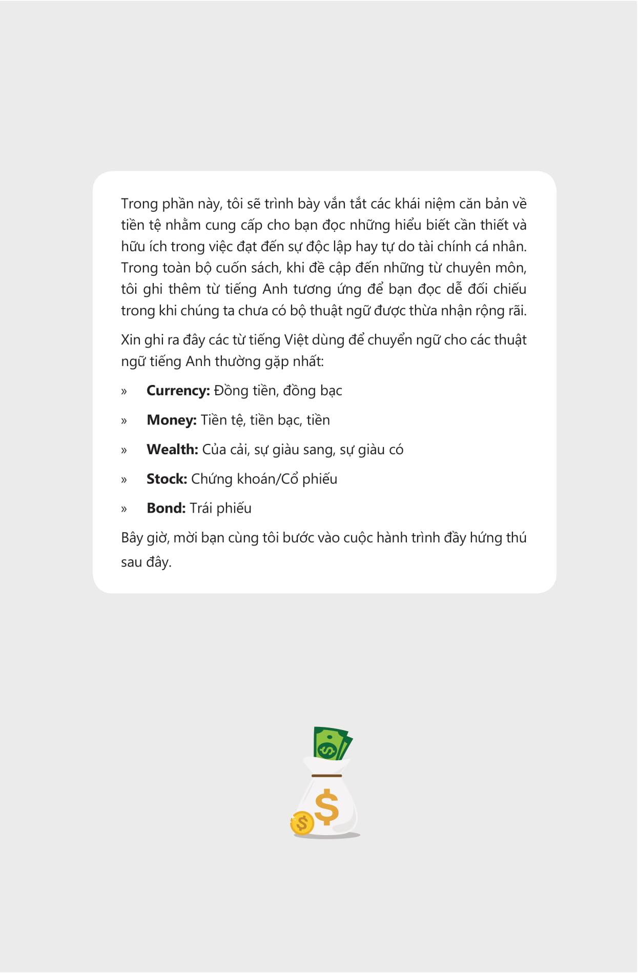 • Phần I – Các khái niệm căn bản: Trình bày những khái niệm căn bản liên quan đến tiền tệ, cho bạn sự hiểu biết nền tảng về cách thức hoạt động của tiền tệ, về vai trò của chính phủ và các định chế tài chính như ngân hàng trung ương.